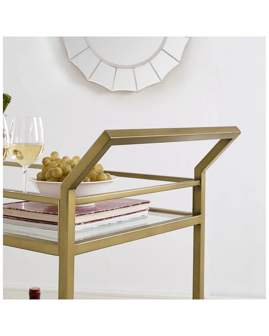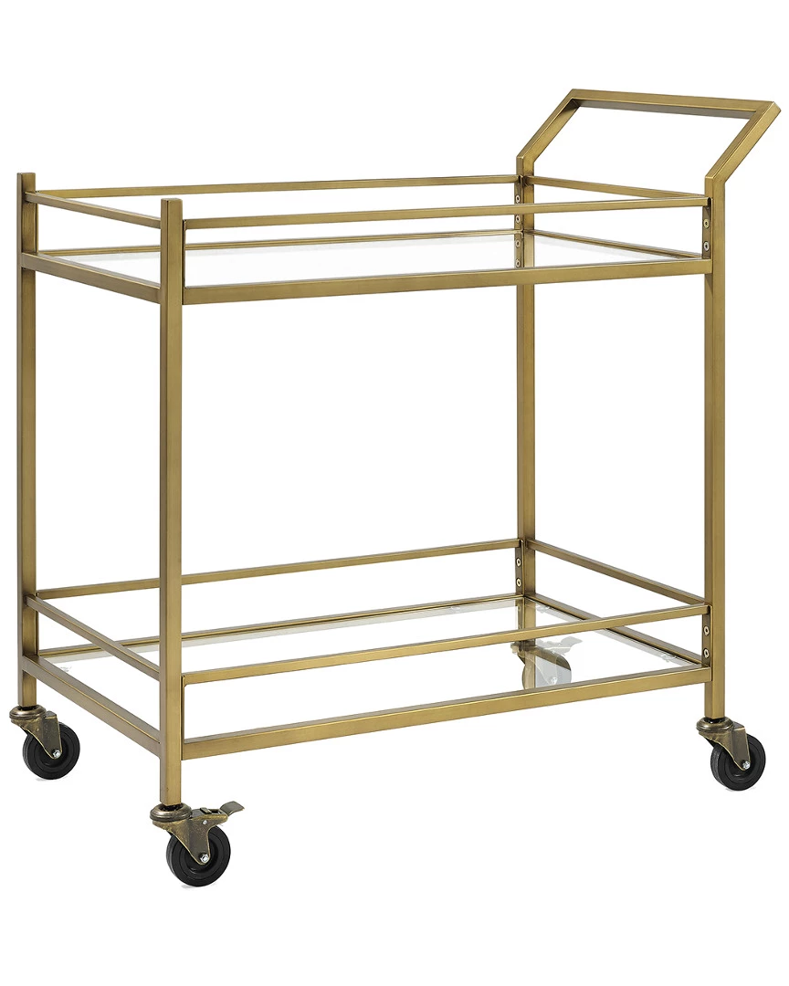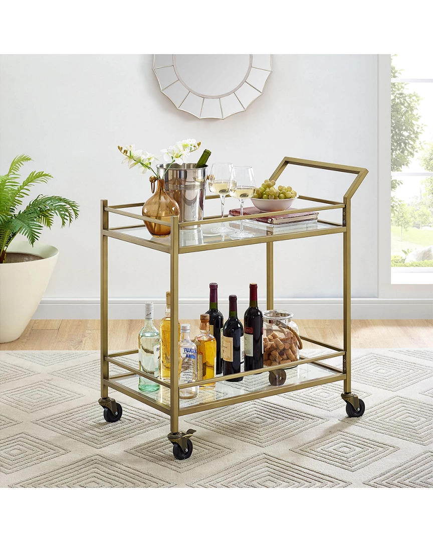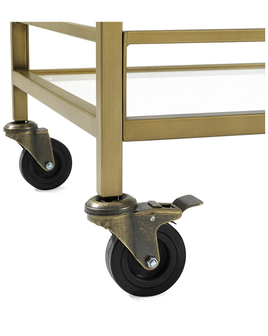 - Design details: Stylish and modern, the Aimee bar cart is an eye-catching addition to any home. The sturdy steel frame and tempered glass shelves create a simple silhouette that works with a variety of decor aesthetics. Fitted with four castors, the Aimee bar cart is a flexible piece that brings spirit to any room in your home. ; Art Deco inspired design; Soft gold finish; Frame is constructed of sturdy steel; Two tempered glass shelves; Includes a total of four caster wheels with two that lock; Pairs with glam, traditional and modern farmhouse decor