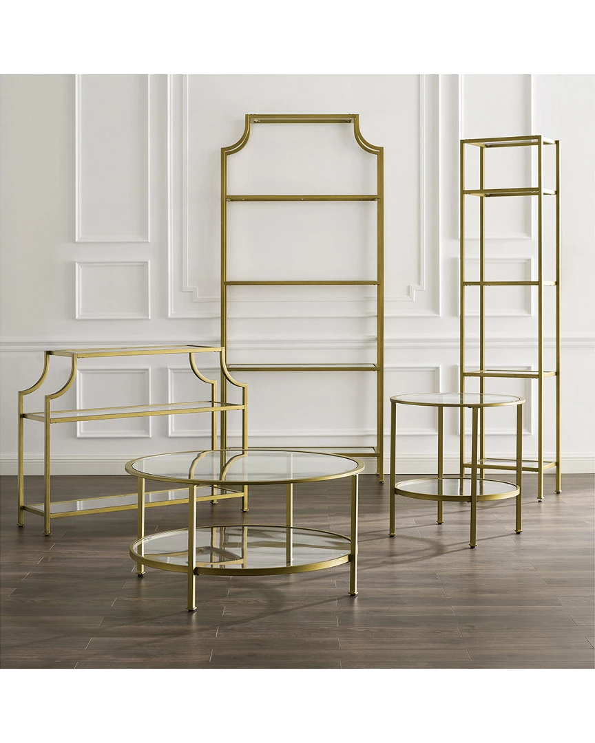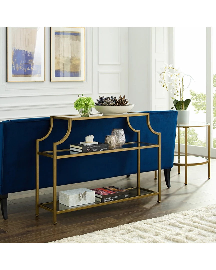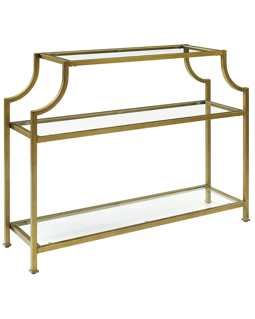 - Design details: Stylish and modern, the Aimee Console Table is an eye-catching addition to any home. A sturdy steel frame with pagoda-styling creates visual interest that can be paired with a variety of decor. The Aimee Console Tables open, tempered glass shelves are perfect for displaying mementos without overwhelming the room. ; Art Deco inspired design; Soft gold finish; Frame is constructed of sturdy steel; Two tempered glass shelves; Pagoda-styled frame; Upscale display and storage for any room; Pairs well with glam, modern farmhouse and traditional decor