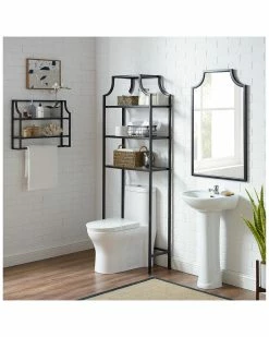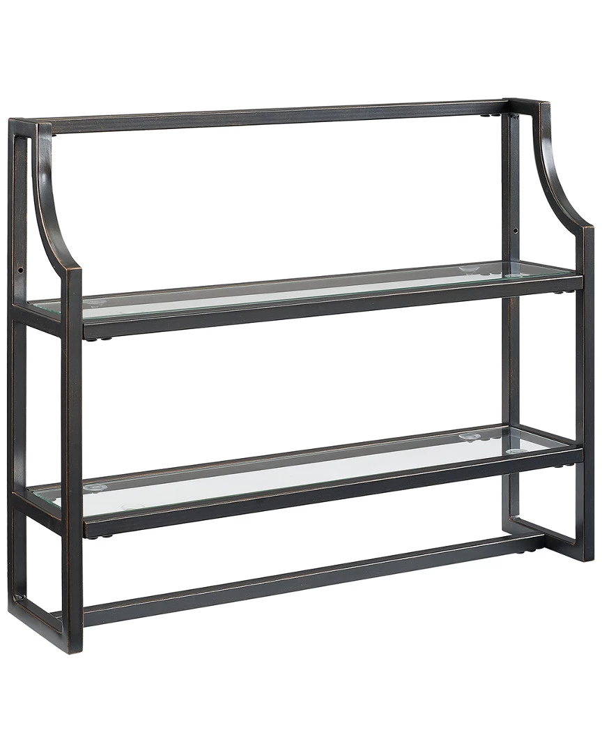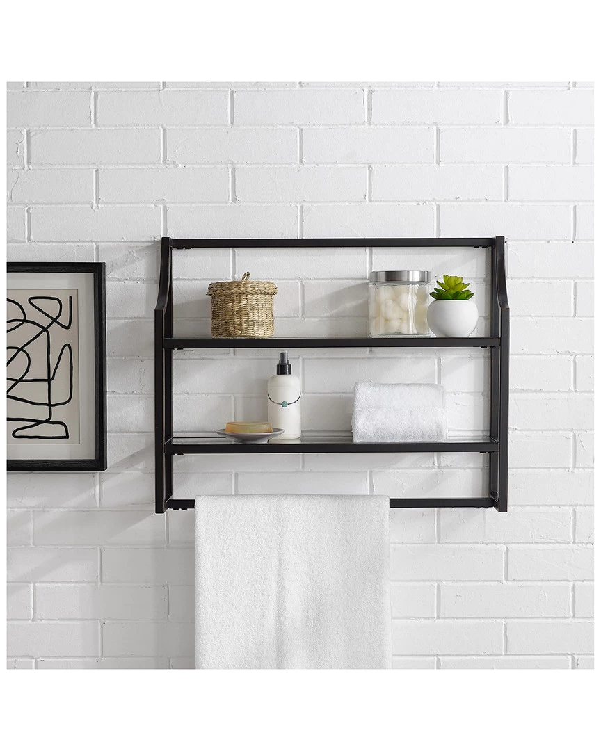 - Design details: Stylish and modern, the Aimee Wall Shelf is an eye-catching and practical storage solution. Featuring two tempered glass shelves and a towel bar, this wall shelf is perfect for storing bathroom essentials without overwhelming the space. The sculptured steel frame adds visual interest, making this a great addition to any bathroom; Art Deco inspired design; Oil-rubbed bronze finish; Frame is constructed of sturdy steel; Two tempered glass shelves for storage or display; Includes a towel bar ; Pairs well with industrial, rustic, traditional and modern farmhouse decor
