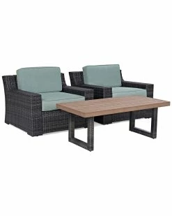 - Design details: Sit back and relax in our spacious Beaufort outdoor conversation set. This dependable, sophisticated seating collection features low-profile club styling with crisp lines and understated curves, resulting in a look that makes your outdoor area an instant oasis. Our easy-to-maintain dark brown synthetic wicker is water and UV resistant, and the solution-dyed polyester, Mist-colored cushions are fade resistant. Seating surfaces are generous in size, and feature resilient foam cushion inserts. The modern coffee table is distinguished by its angular base, and top that features all-weather faux wood planks with embossed grain details. With the Beaufort collection from Crosley Furniture, comfort lives outside.