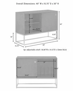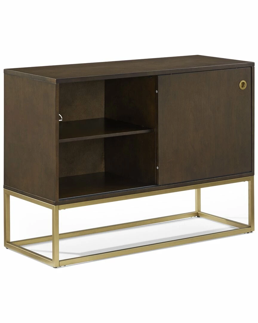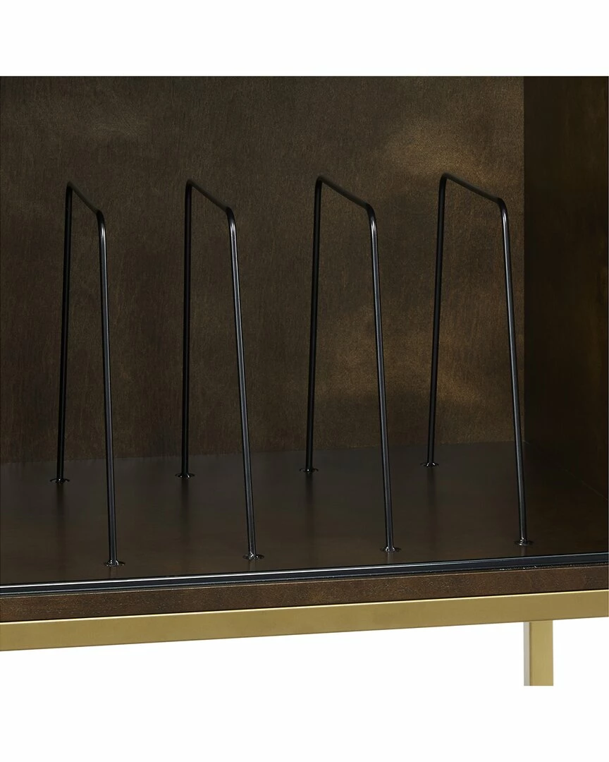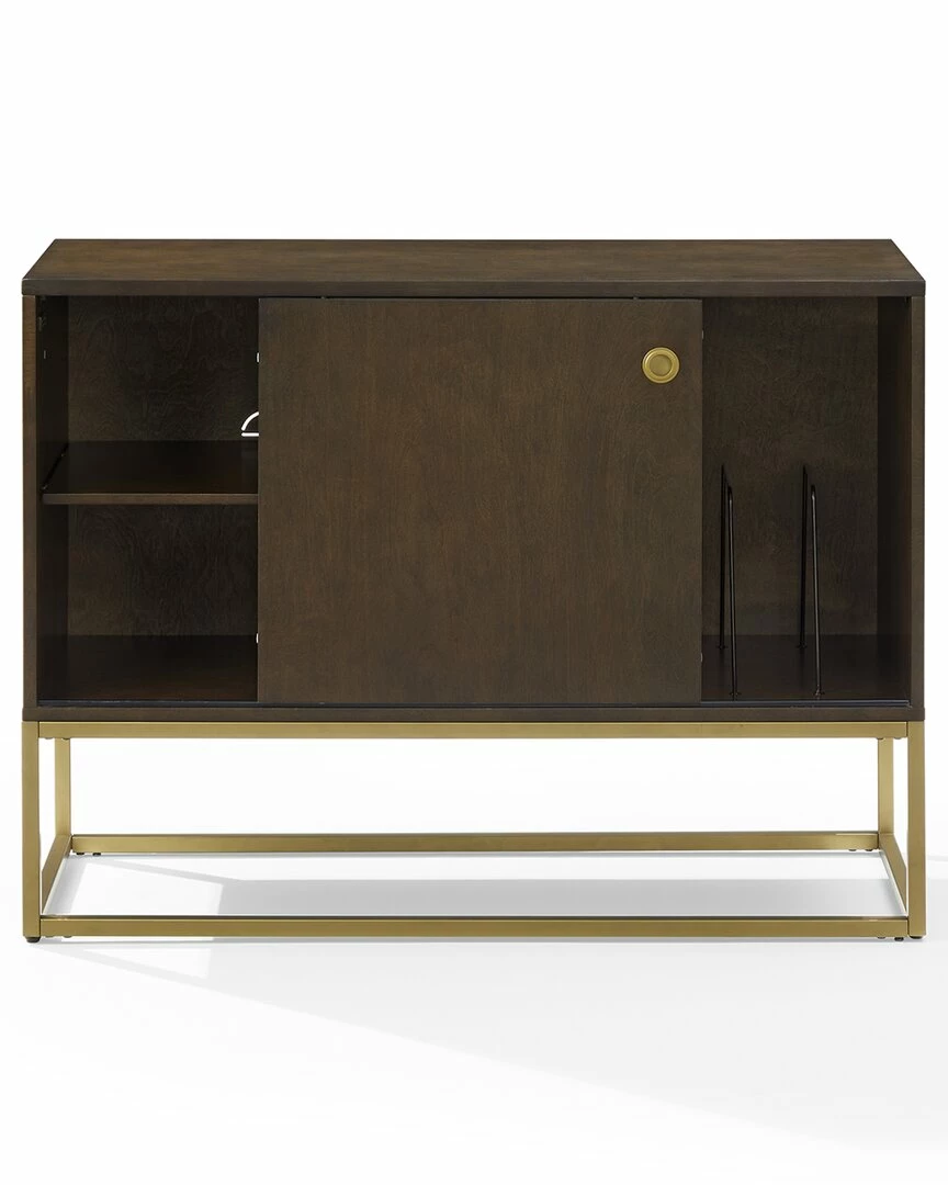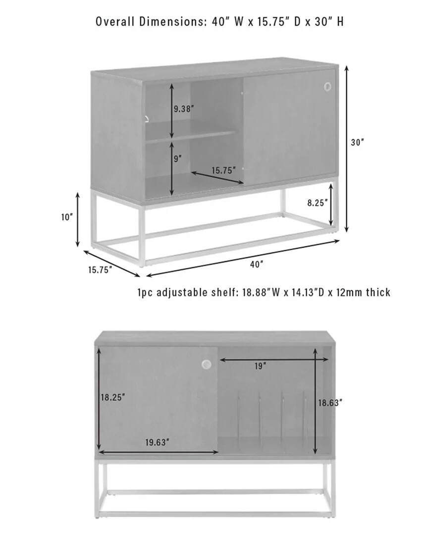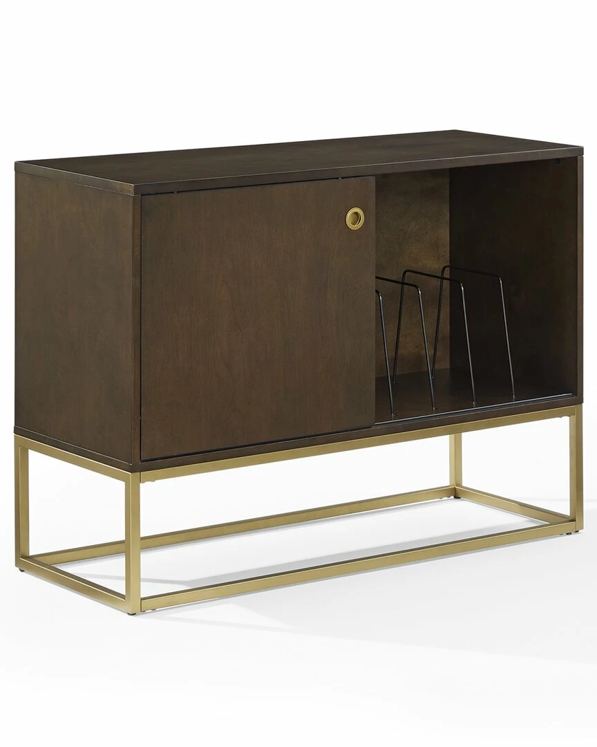 - The Byron Media Console provides storage while also showcasing your treasured vinyl. Featuring a modern, streamlined look, this console has a single sliding door with a flush door pull and a sleek metal frame base. The single sliding door opens to an adjustable shelf for media components on one side or to wire racks for record storage on the other. Place your favorite turntable on top and youll be ready to jam with the Byron Media Console.