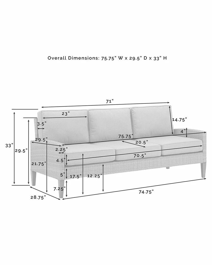 - Bring coastal swagger to outdoor entertaining with the Capella 4pc Sofa Set. Blending cool neutral tones with natural finishes, this set is sure to be the talk of the party. All-weather resin wicker and quick-drying olefin fabric come together to create durable outdoor seating. With a stylish mix of elements, the coffee table pairs resin wicker with a slatted steel top hand-painted to look like wood. The sofa, chairs, and coffee table also have sturdy steel tapered legs that resemble real wood, making the Capella 4pc Sofa Set durable and unique.