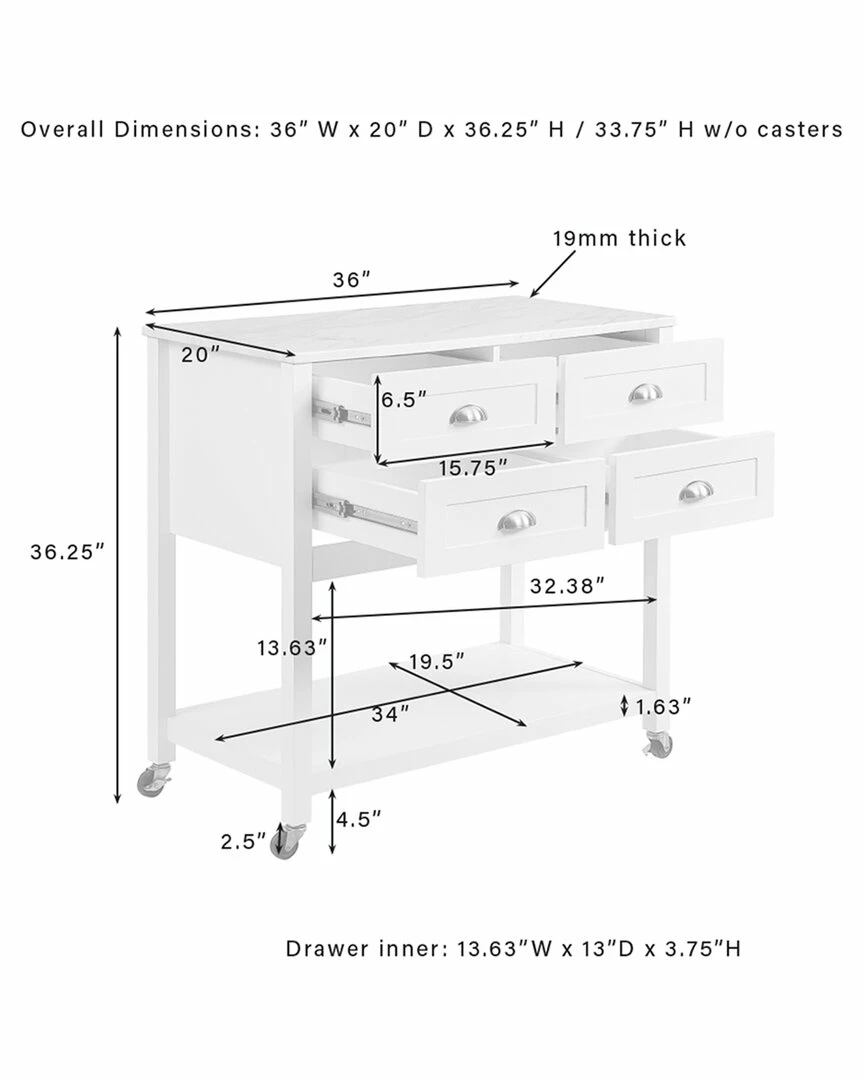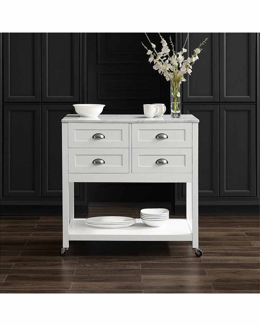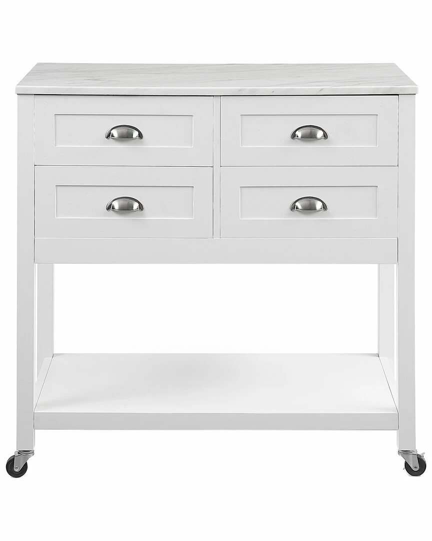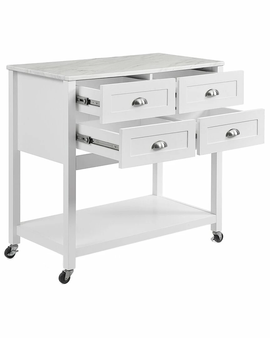 - Elevate any kitchen with the high-end look of the Connell Kitchen Island/Cart. Ideal for adding counter space and extra storage, this kitchen island features four sizeable drawers perfect for utensils, flatware, and linens. An open stationary shelf can store larger items or be used for display. With optional casters and a beautiful faux marble countertop, the Connell Kitchen Island/Cart makes for a stylish coffee bar or mobile island.