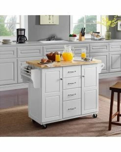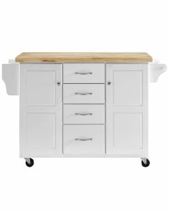 - Design details: Prepare all your meals with ease using our Elliott Kitchen Cart. This cart features a natural wood built up top and numerous storage options to stow away all your prepping utensils. There are four spacious drawers and two cabinets along with a spice rack and towel rack on the ends. Constructed of solid hardwood and veneers with castors for mobility this sturdy cart will complement your kitchen decor while also providing much needed functionality.