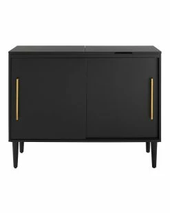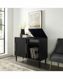 - Design details: Add polish and style to your home with the sleek mid-century modern design of the Everett Media Console. Whether you need a home for your favorite turntable and album collection or a stylish accent cabinet, this media console has the versatility to fit the bill. Featuring sliding cabinet doors that open to adjustable shelving on one side, and album storage on the other, the Everett Media Console is a perfect storage solution for your home; Mid-century modern design; Matte black finish; Hinged top compartment reveals space for a component turntable; Two sliding cabinet doors; Wire slots for record storage; Holds approximately 75 albums; Adjustable shelves; Tapered Legs; Genuine metal hardware in a brushed gold finish