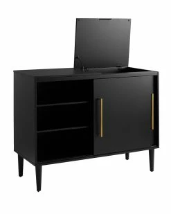 - Design details: Add polish and style to your home with the sleek mid-century modern design of the Everett Media Console. Whether you need a home for your favorite turntable and album collection or a stylish accent cabinet, this media console has the versatility to fit the bill. Featuring sliding cabinet doors that open to adjustable shelving on one side, and album storage on the other, the Everett Media Console is a perfect storage solution for your home; Mid-century modern design; Matte black finish; Hinged top compartment reveals space for a component turntable; Two sliding cabinet doors; Wire slots for record storage; Holds approximately 75 albums; Adjustable shelves; Tapered Legs; Genuine metal hardware in a brushed gold finish