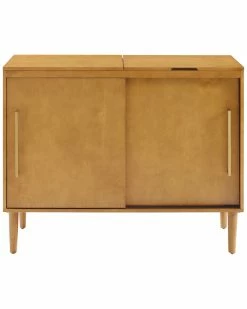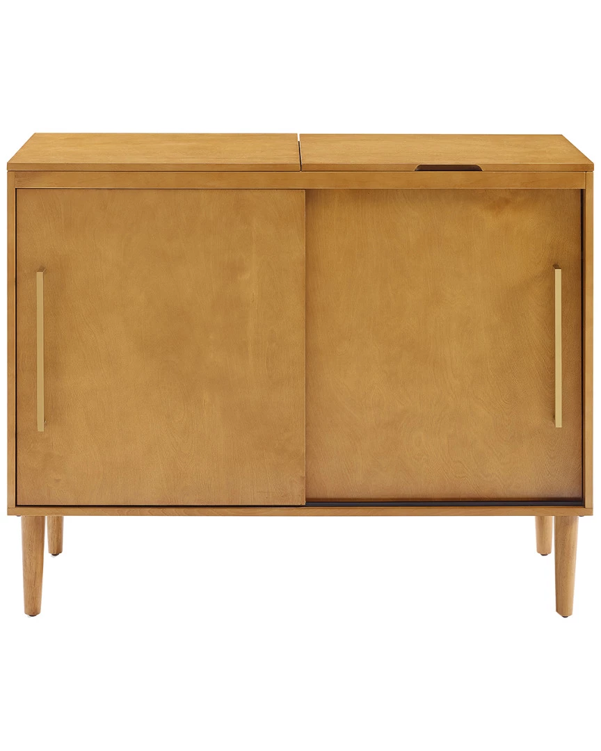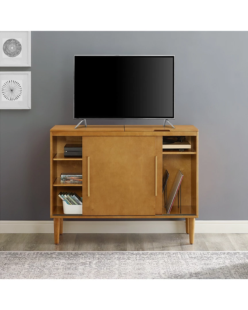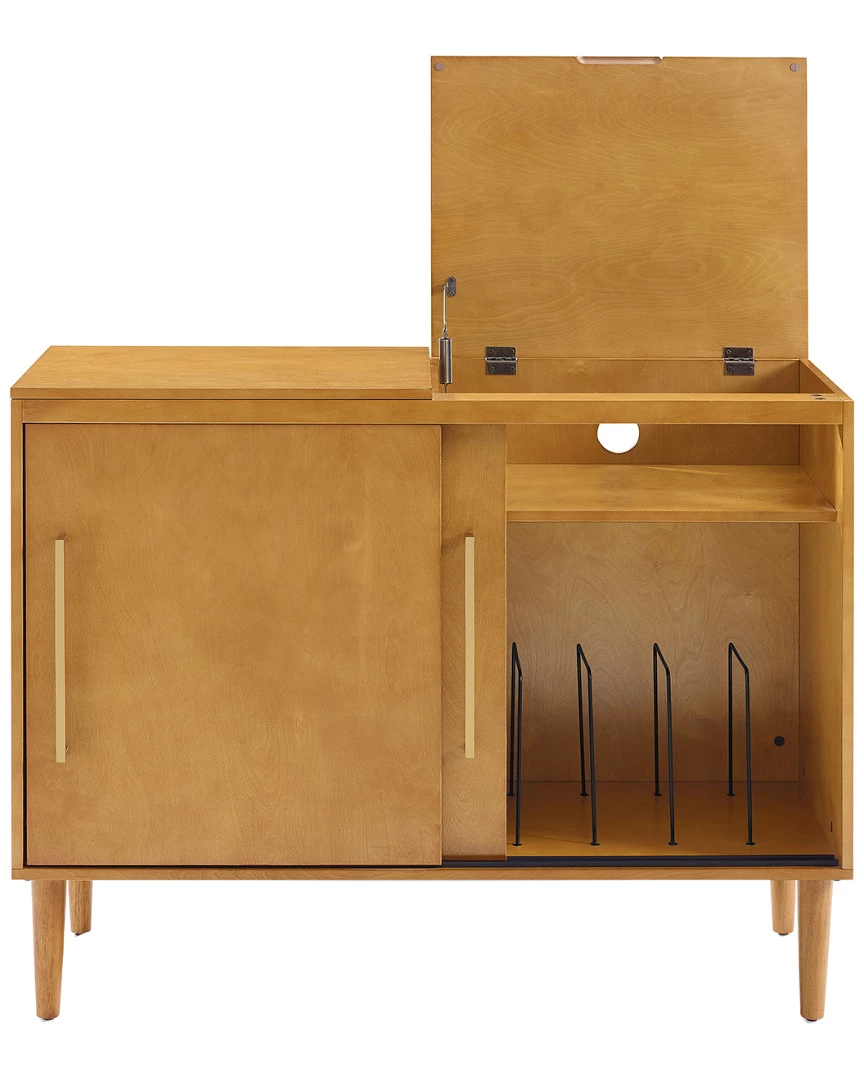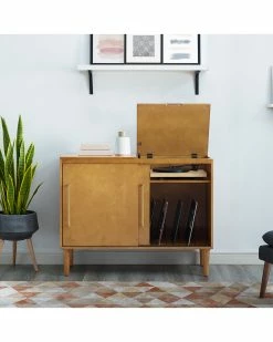 - Design details: Add polish and style to your home with the sleek mid-century modern design of the Everett Media Console. Whether you need a home for your favorite turntable and album collection or a stylish accent cabinet, this media console has the versatility to fit the bill. Featuring sliding cabinet doors that open to adjustable shelving on one side, and album storage on the other, the Everett Media Console is a perfect storage solution for your home; Mid-century modern design; Acorn finish; Hinged top compartment reveals space for a component turntable; Two sliding cabinet doors; Wire slots for record storage; Holds approximately 75 albums; Adjustable shelves; Tapered Legs; Genuine metal hardware in a brushed gold finish