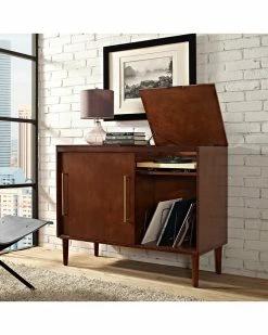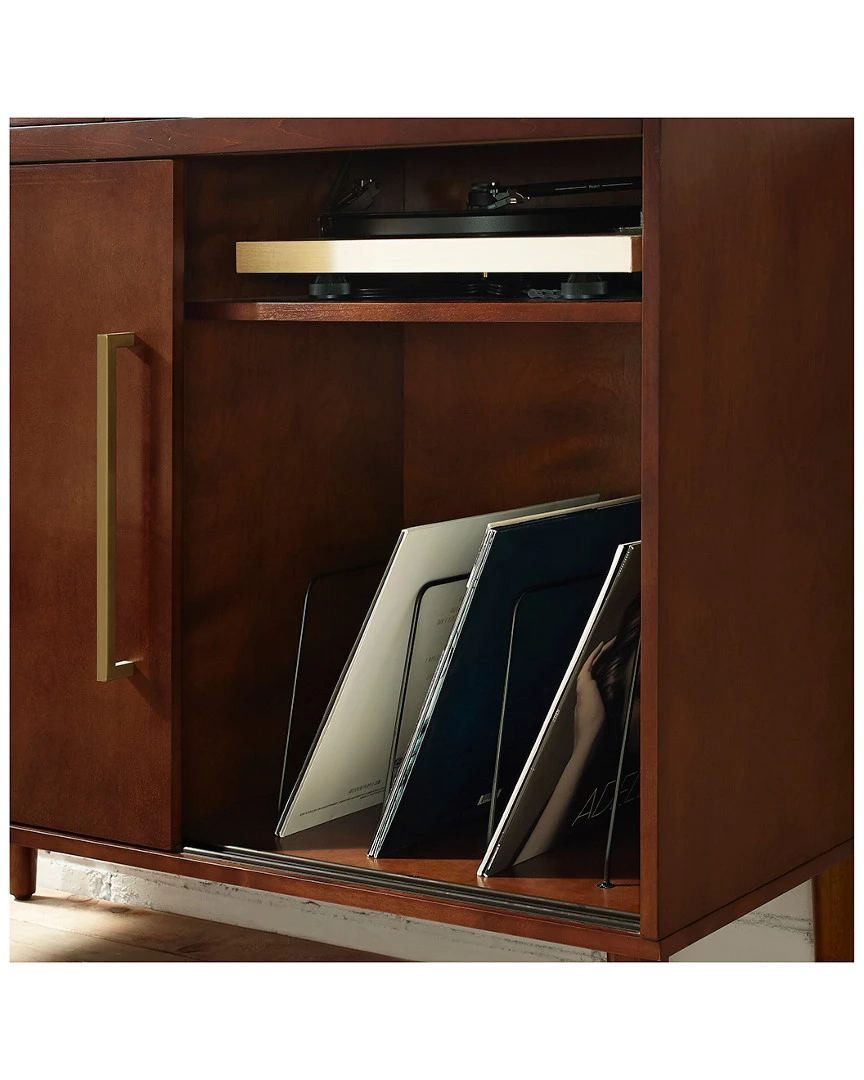 - Design details: Add polish and style to your home with the sleek mid-century modern design of the Everett Media Console. Whether you need a home for your favorite turntable and album collection or a stylish accent cabinet, this media console has the versatility to fit the bill. Featuring sliding cabinet doors that open to adjustable shelving on one side, and album storage on the other, the Everett Media Console is a perfect storage solution for your home.