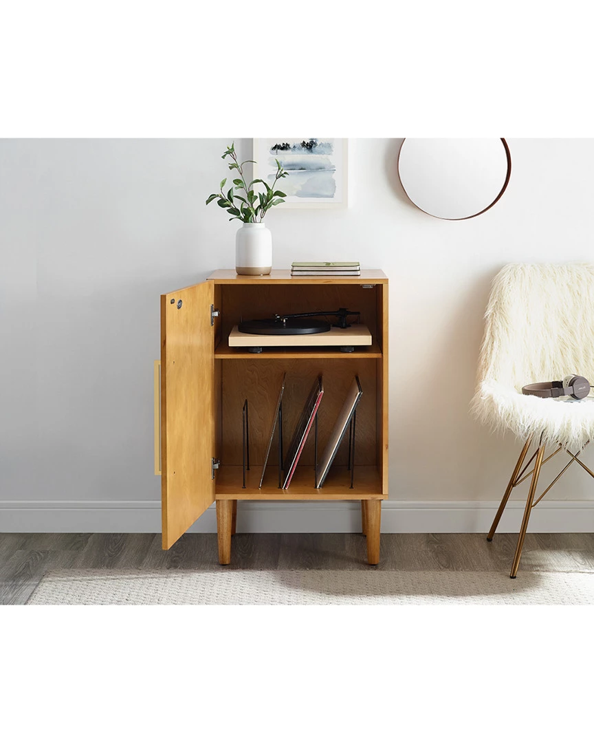 - Design details: The classic mid-century modern design of the Everett Record Player Stand is the perfect complement to your treasured turntable and precious vinyl. Sized perfectly to accommodate most component-style record players, this stand is as functional as it is stylish. Tucked behind the cabinet door are wire record dividers and an adjustable shelf for storing accessories or a second turntable, making the Everette Record Player Stand a must have for any vinyl enthusiast; Mid-century modern design; Acorn finish; Accessory shelf; Full overlay door; Wire slots for record storage; Holds approximately 75 albums; Tapered legs; Genuine metal hardware in a brushed gold finish