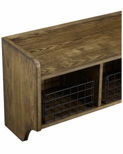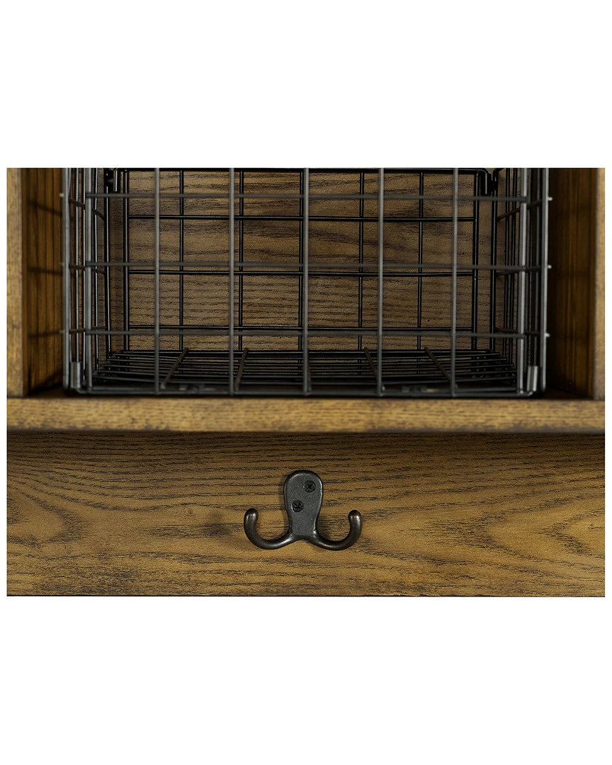 - Design details: Keep your entryway clutter-free with the Fremont Entryway Shelf. The shelf includes three coat hooks and three galvanized wire baskets for storage. The shelf is easy to mount and can be paired with the rest of the Freemont Collection; Antique Finish; Three Galvanized Wire Baskets; Easy To Mount Design; Three Well Spaced Coat Hooks; Constructed of MDF with a Coffee Veneer; Mounting Hardware Included; Top Easy Access Shelf; Light Assembly Required