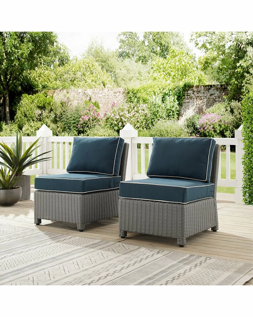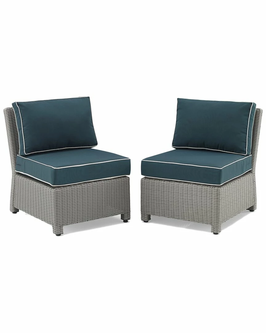 - Outdoor relaxation has never looked better than with the Bradenton 2pc Armless Chair Set. The sturdy steel frames are wrapped in beautiful all-weather wicker and topped with moisture-resistant cushions. With a versatile modular design and deep seating, the Bradenton armless chair set is made for comfort without sacrificing style. Great on their own or paired with the rest of the Bradenton collection, these chairs are a lovely addition to your outdoor retreat. Traditional design.UV resistant all-weather half-round resin wicker.Weather-resistant powder-coated steel frame.Handwoven gray resin wicker.Navy cushion covers with contrast white piping.High-performance solution-dyed polyester cushion covers resist mildew, sun fade, and abrasion.Moisture-resistant high grade cushion cores.Removable cushion covers are machine washable.5″ thick seat cushion and 4″ thick back cushion.Adjustable levelers on legs.Modular design pairs with other items in this collection.Ideal for small outdoor spaces……..