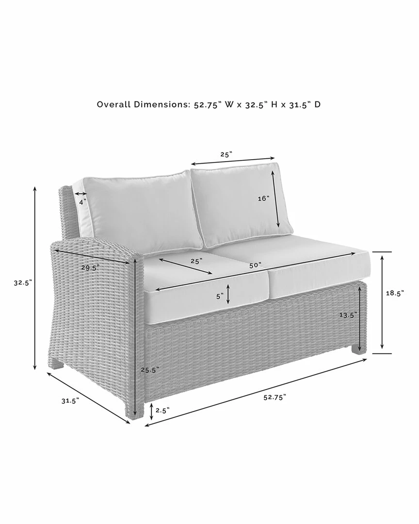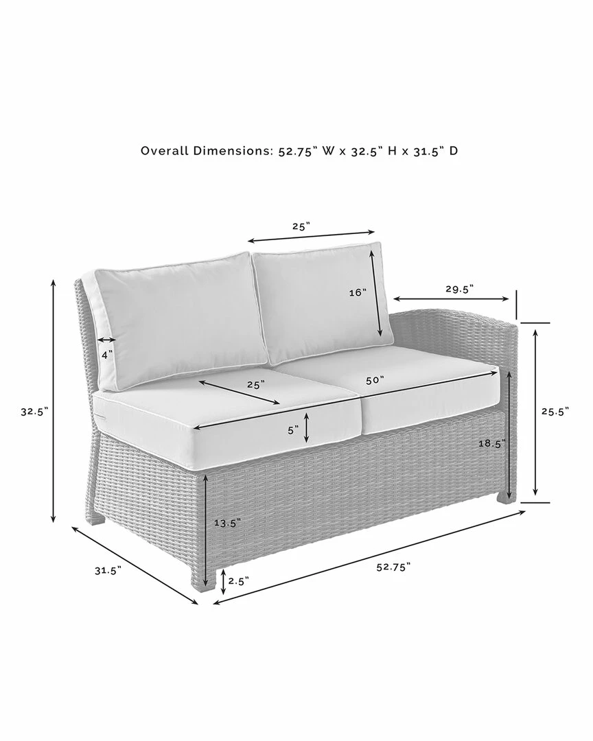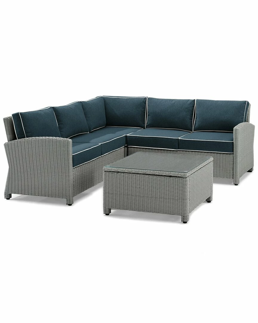 - Whether you are lounging solo or entertaining a group, the Bradenton 4pc Sectional Set fits the bill. The sturdy steel frame is wrapped in beautiful all-weather wicker and topped with moisture-resistant cushions, making this sectional set both durable and stylish. The Bradenton sectional provides the utmost flexibility and comfort with its modular design, gently arched arms, and deep seating. Add in the included glass-top coffee table and the Bradenton 4pc Sectional Set will make outdoor entertaining a breeze. Traditional design.UV resistant all-weather half-round resin wicker.Weather-resistant powder-coated steel frame.Handwoven gray resin wicker.Navy cushion covers with contrast white piping.Navy cushion covers with contrast white piping.High-performance solution-dyed polyester cushion covers resist mildew, sun fade, and abrasion.High-performance solution-dyed polyester cushion covers resist mildew, sun fade, and abrasion.Moisture-resistant high grade cushion cores.Removable cushion covers are machine washable.5″ thick seat cushion and 4″ thick back cushion.Adjustable levelers on legs.Tempered glass tabletop.Clips for attaching sectional pieces are included.Modular seating for up to five.Modular design allows for a variety of seating configurations.Corner Chair Dimensions – 32.5″H x 31.5″W x 31.5″D.Square Coffee Table Dimensions – 17.75″H x 32″W x 32″D.Left/Right Loveseat Dimensions – 32.5″H x 52.75″W x 31.5″D.Right Loveseat Dimensions – 32.5″H x 52.75″W x 31.5″D
