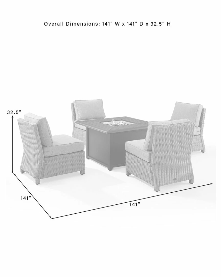 - Gather around the fire for a relaxing evening with the Bradenton 5pc Conversation Set. Four all-weather resin wicker armless chairs surround a powder-coated steel fire table, for cozy outdoor entertaining. Each chair features back and seat cushions covered in a solution-dyed polyester providing durability and comfort. The fire table’s slatted top and solid paneled base offer a simple design that blends with a variety of outdoor spaces. The gas controls and a rack for a propane tank are located inside the table’s base, keeping them close at hand but out of sight. You’ll be ready to relax in comfort with the Bradenton conversation set. Traditional design.UV resistant all-weather half-round resin wicker.Weather-resistant powder-coated steel frame.Handwoven gray resin wicker.Gray cushion covers.High-performance solution-dyed polyester cushion covers resist mildew, sun fade, and abrasion.Moisture-resistant high grade cushion cores.Removable cushion covers are machine washable.Slatted design on fire tabletop.Fire table gas controls and propane tank store inside table.Fire table comes with 10lbs of black glass fire beads.Fire table uses standard 20lb propane tank – Not Included.Fire table comes with a lid and protective covers for the table and propane tank (Propane tank not included).One AAA battery required, not included.Seating for four.Fire Table Dimensions – 41.88″W x 41.88″D x 25.13″H.Armless Chair Dimensions: 32.5″H x 25″W x 31.5″D…
