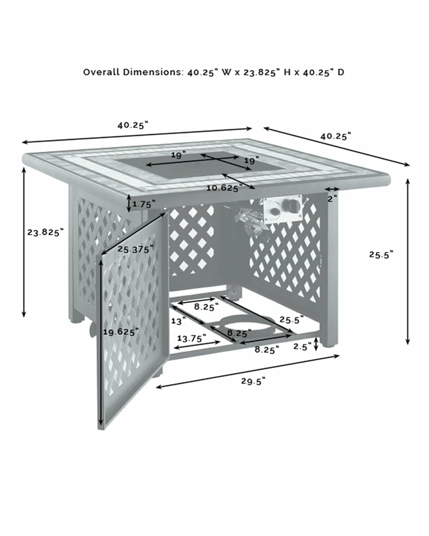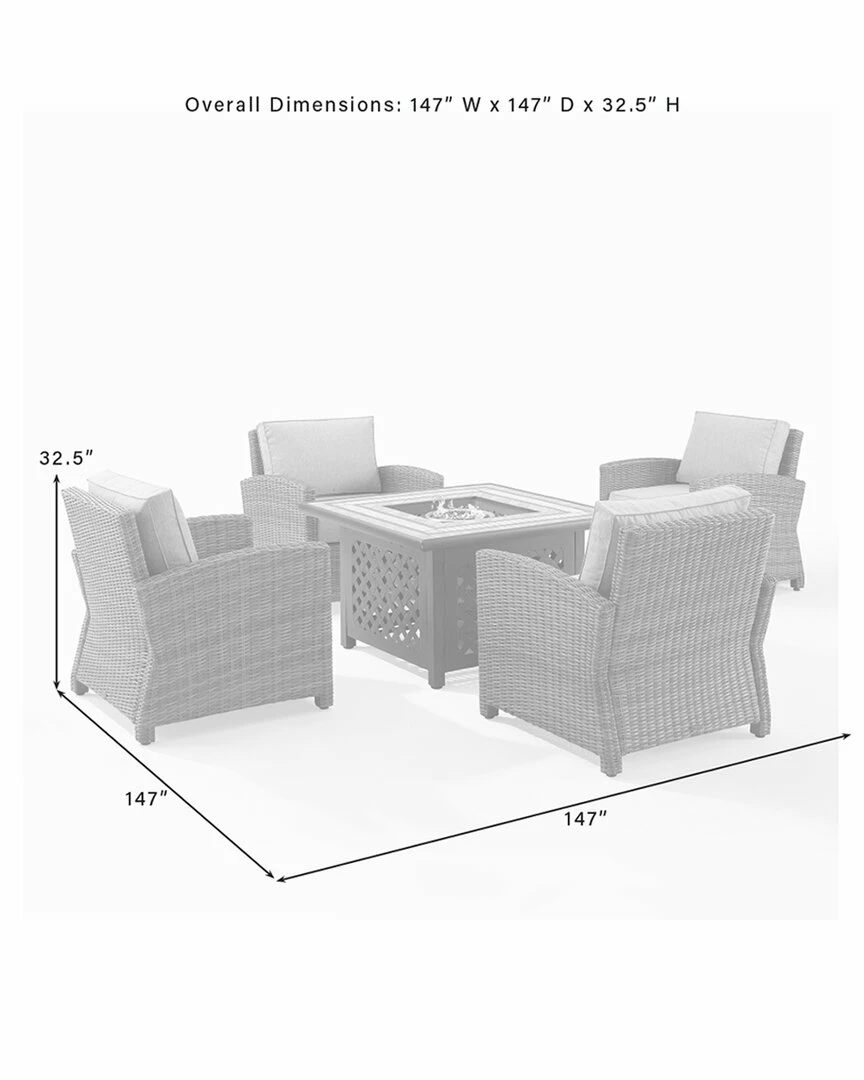 - Gather around the fire for a relaxing evening with the Bradenton 5pc Conversation Set. Four all-weather resin wicker armchairs surround a powder-coated steel fire table, for cozy outdoor entertaining. Each chair features back and seat cushions covered in a solution-dyed polyester providing durability and comfort. The fire table’s tiled stone top and lattice panel base offer a unique design that complements a variety of outdoor spaces. The gas controls and a rack for a propane tank are located inside the table’s base, keeping them close at hand but out of sight. You’ll be ready to relax in comfort with the Bradenton conversation set. Traditional design.UV resistant all-weather half-round resin wicker.Weather-resistant powder-coated steel frame.Handwoven weathered brown resin wicker.Neutral sand cushion covers with white piping.High-performance solution-dyed polyester cushion covers resist mildew, sun fade, and abrasion.Moisture-resistant high grade cushion cores.Removable cushion covers are machine washable.Fire table has a tiled stone top.Fire table gas controls and propane tank store inside table.Fire table comes with 10lbs of black glass fire beads.Fire table uses standard 20lb propane tank – Not Included.Fire table comes with a lid and protective covers for the table and propane tank (Propane tank not included).One AAA battery required, not included.Seating for four.Fire Table Dimensions – 40.25″W x 40.25″D x 25.5″H.Armchair Dimensions – 32.5″H x 30.5″W x 31.75″D / 32lbs…