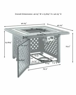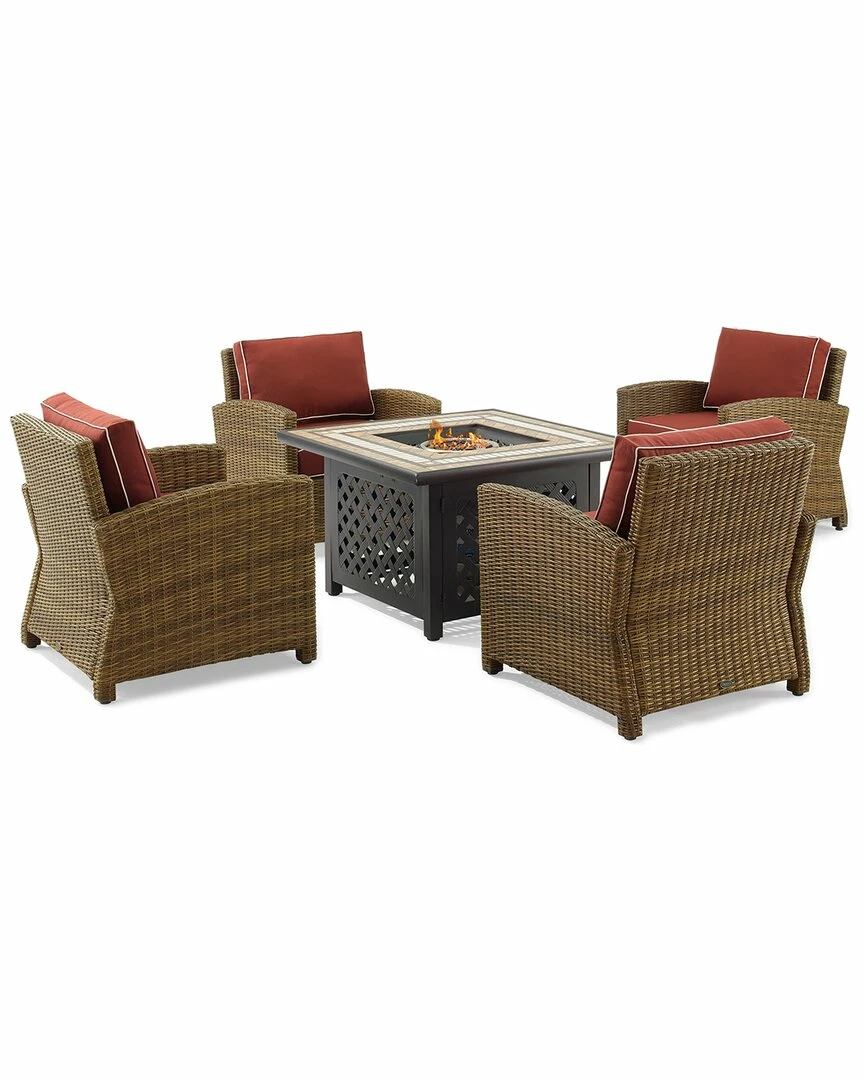 - Gather around the fire for a relaxing evening with the Bradenton 5pc Conversation Set. Four all-weather resin wicker armchairs surround a powder-coated steel fire table, for cozy outdoor entertaining. Each chair features back and seat cushions covered in a solution-dyed polyester providing durability and comfort. The fire table’s tiled stone top and lattice panel base offer a unique design that complements a variety of outdoor spaces. The gas controls and a rack for a propane tank are located inside the table’s base, keeping them close at hand but out of sight. You’ll be ready to relax in comfort with the Bradenton conversation set. Traditional design.UV resistant all-weather half-round resin wicker.Weather-resistant powder-coated steel frame.Handwoven weathered brown resin wicker.Deep sangria cushion covers with white piping.High-performance solution-dyed polyester cushion covers resist mildew, sun fade, and abrasion.Moisture-resistant high grade cushion cores.Removable cushion covers are machine washable.Fire table has a tiled stone top.Fire table gas controls and propane tank store inside table.Fire table comes with 10lbs of black glass fire beads.Fire table uses standard 20lb propane tank – Not Included.Fire table comes with a lid and protective covers for the table and propane tank (Propane tank not included).One AAA battery required, not included.Seating for four.Fire Table Dimensions – 40.25″W x 40.25″D x 25.5″H.Armchair Dimensions – 32.5″H x 30.5″W x 31.75″D / 32lbs…