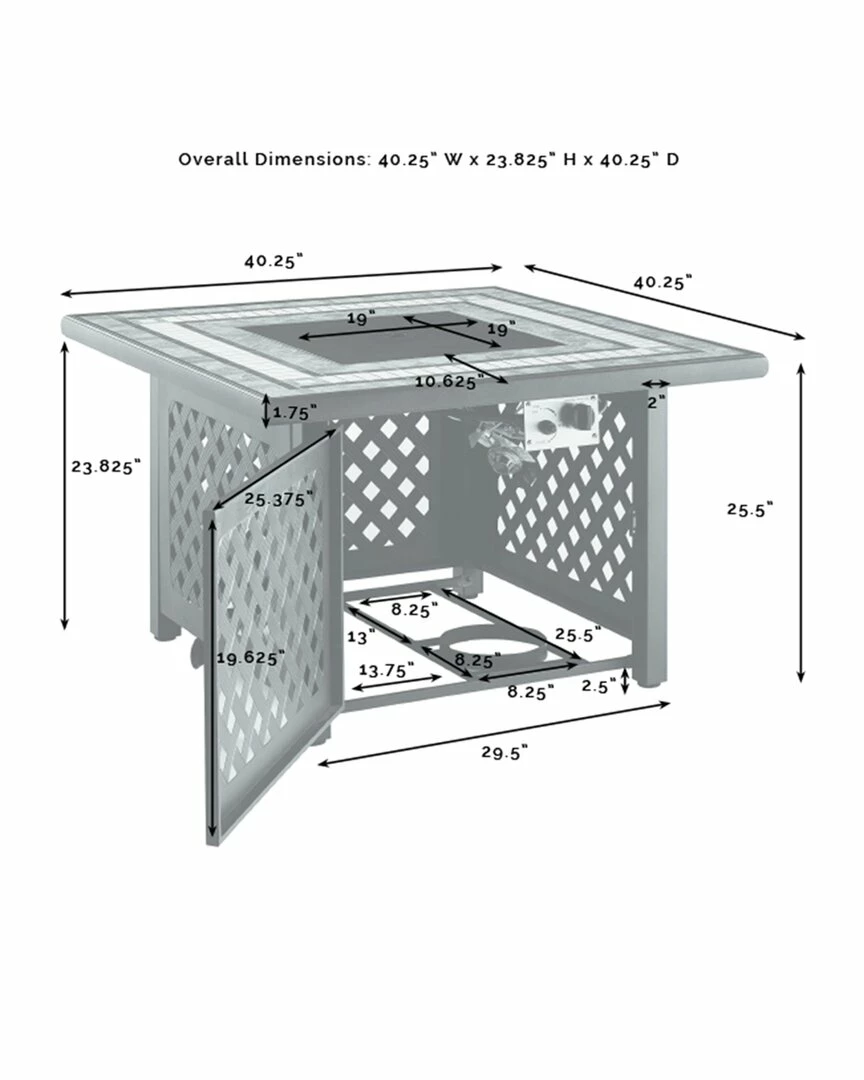 - Traditional design.UV resistant all-weather half-round resin wicker.Weather-resistant powder-coated steel frame.Handwoven weathered brown resin wicker.Neutral sand cushion covers with white piping.High-performance solution-dyed polyester cushion covers resist mildew, sun fade, and abrasion.Moisture-resistant high grade cushion cores.Removable cushion covers are machine washable.Fire table has a tiled stone top.Fire table gas controls and propane tank store inside table.Fire table comes with 10lbs of black glass fire beads.Fire table uses standard 20lb propane tank – Not Included.Fire table comes with a lid and protective covers for the table and propane tank (Propane tank not included).One AAA battery required, not included.Seating for four.Fire Table Dimensions – 40.25″W x 40.25″D x 25.5″H.Armless Chair Dimensions: 32.5″H x 25″W x 31.5″D…