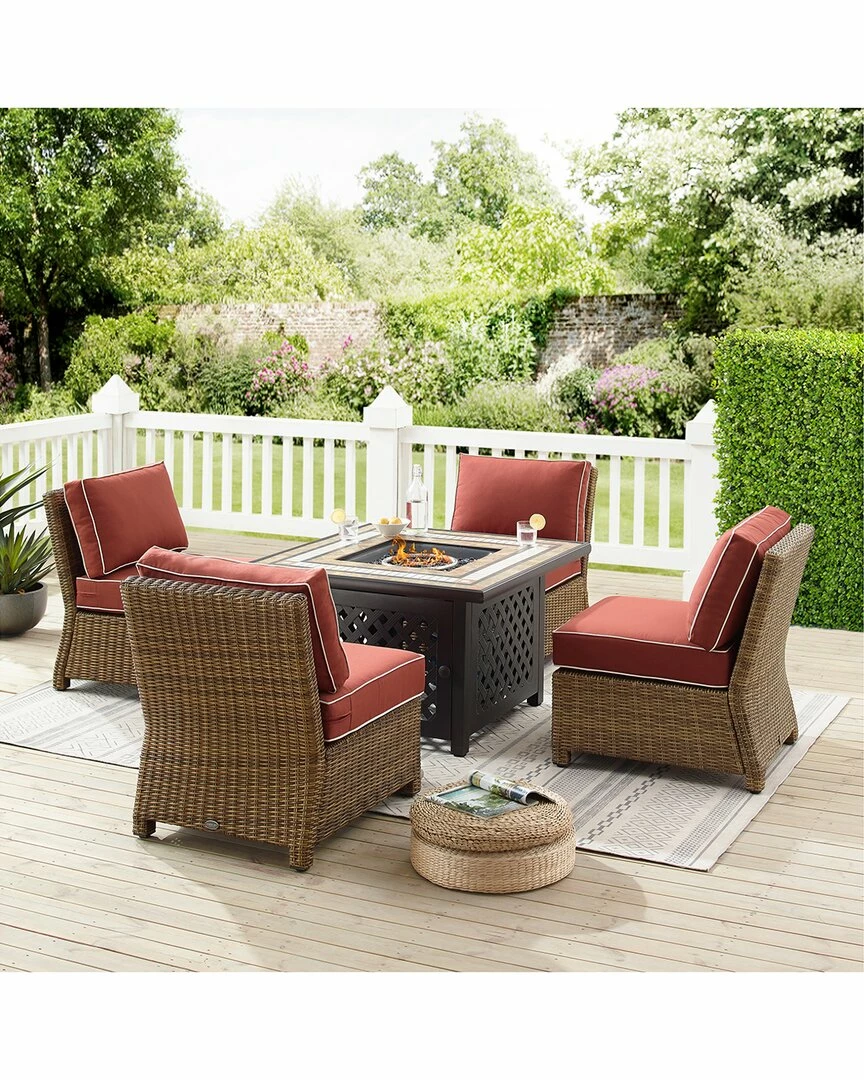 - Gather around the fire for a relaxing evening with the Bradenton 5pc Conversation Set. Four all-weather resin wicker armless chairs surround a powder-coated steel fire table, for cozy outdoor entertaining. Each chair features back and seat cushions covered in a solution-dyed polyester providing durability and comfort. The fire table’s tiled stone top and lattice panel base offer a unique design that complements a variety of outdoor spaces. The gas controls and a rack for a propane tank are located inside the table’s base, keeping them close at hand but out of sight. You’ll be ready to relax in comfort with the Bradenton conversation set.