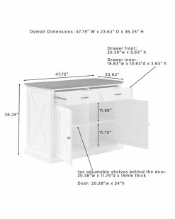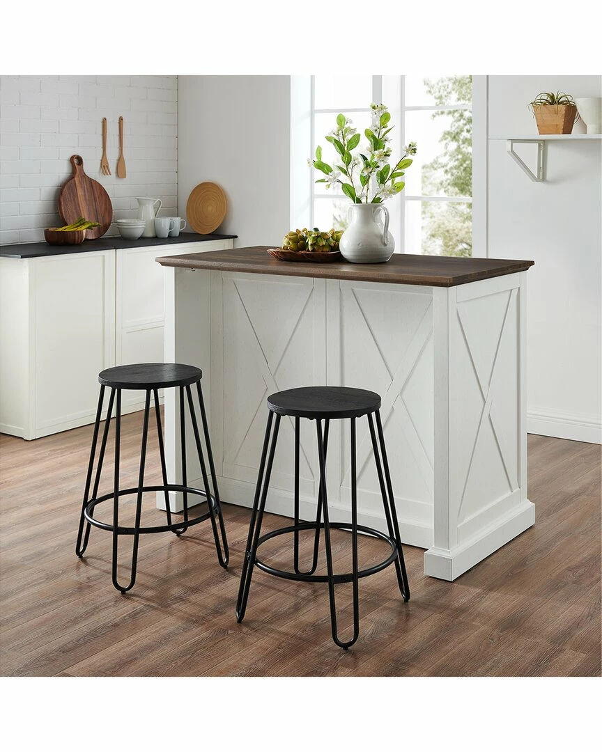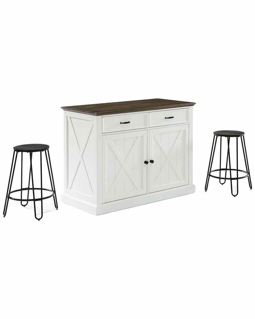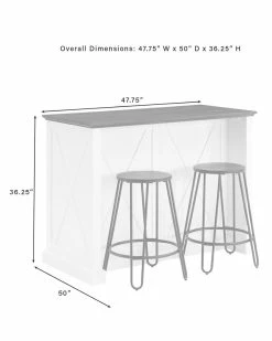 - Delivering modern farmhouse charm to your kitchen, the Clifton Kitchen Island with Ava Stools provides space for food prep and dining. An ideal focal point for your culinary space, the island features a large countertop, plus an overhang for the counter height stools. Each backless stool has a solid wood seat and unique hairpin legs. Featuring two large cabinets with adjustable shelving and two full-extension drawers, the island will keep your kitchen organized and clutter-free. Perfect as a breakfast bar, dining area, or for dishing up your favorite meal, the Clifton Kitchen Island with Ava Stools is a fabulous addition to your home. Modern farmhouse design.Distressed white finish on kitchen island.Faux wood countertop in a dark brown finish.Stools are constructed of steel with a solid elm wood seat.Black finish on stools.Genuine metal hardware in a gunmetal finish.Rustic x design on cabinet doors, sides, and back of the island.Cabinet doors on island have magnetic closures.The island has an adjustable shelf inside each cabinet with a 15lb weight limit per shelf.The island has two full-extension drawers on ball-bearing glides, each with a 15lb weight limit.The island’s countertop overhang provides space for the included counter height stools.Pairs well with traditional decor.Countertop weight limit is 100lbs.Kitchen Island Dimensions: 47.75″W x 23.63″D x 36.5″H / 157.30lbs.Stool Dimensions: 19.63″W x 19.63″D x 23.88″H / 7.92lbs…..