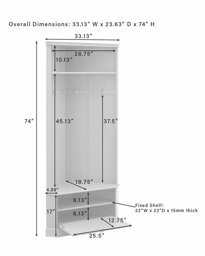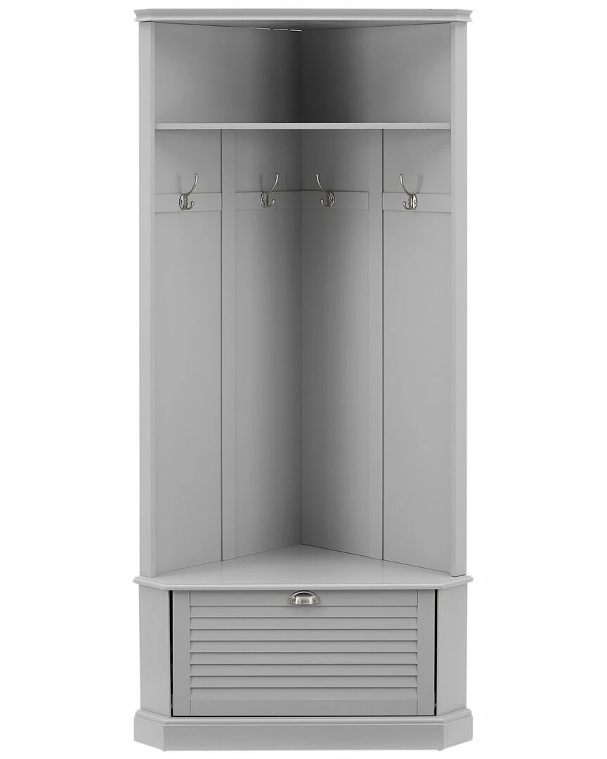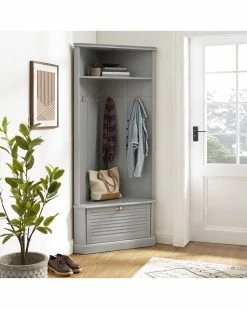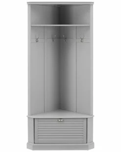 - Keep your home’s entryway tidy and organized with the Ellison Corner Hall Tree. Featuring louvered accents on the drop-down cabinet door and raised paneling on the back, this hall tree gives home organization a classic look. This hall tree’s corner-hugging design makes it the perfect coat rack and landing zone for any size entryway. With hooks for hats and a lower cabinet for shoes, the Ellison Corner Hall Tree offers stylish storage wherever it goes.