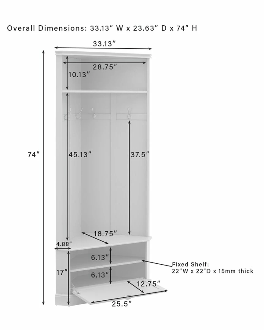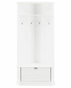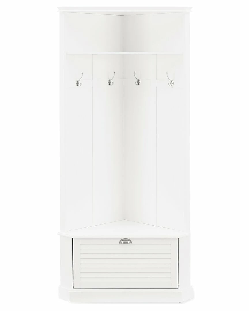- Keep your home’s entryway tidy and organized with the Ellison Corner Hall Tree. Featuring louvered accents on the drop-down cabinet door and raised paneling on the back, this hall tree gives home organization a classic look. This hall tree’s corner-hugging design makes it the perfect coat rack and landing zone for any size entryway. With hooks for hats and a lower cabinet for shoes, the Ellison Corner Hall Tree offers stylish storage wherever it goes.