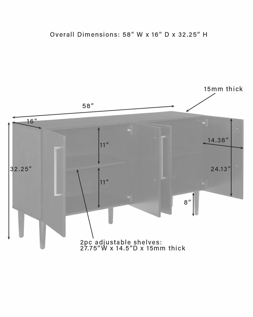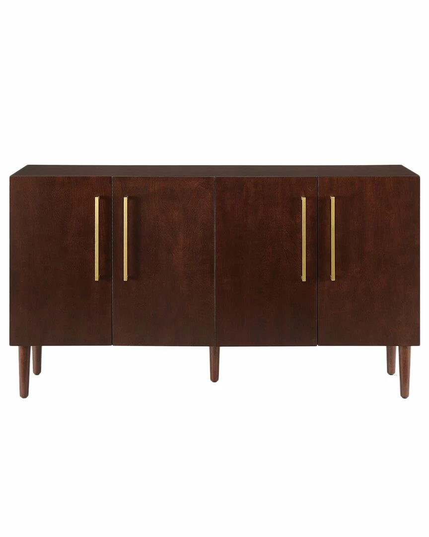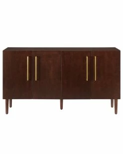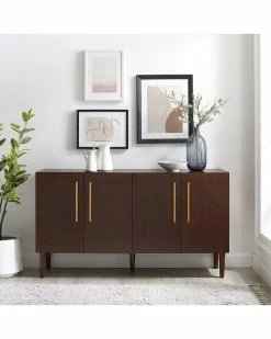 - Bring mid-century vibes to your dining room or kitchen with the Everett Sideboard. Perfect for tucking away dishes and barware, this sideboard provides two large cabinets with adjustable shelving. Perched atop tapered legs and showcasing classic bar hardware, the Everett Sideboard will add polish and style to any room. Mid-century modern design.Mahogany finish.Genuine metal hardware in a brushed gold finish.Two large cabinets with double doors and magnetic closures.Adjustable and removable shelf inside cabinet with a 15lb weight limit.Tapered legs.Adjustable levelers on legs.Pairs well with modern, farmhouse, and rustic decor.Sideboard top weight limit is 100lbs………..