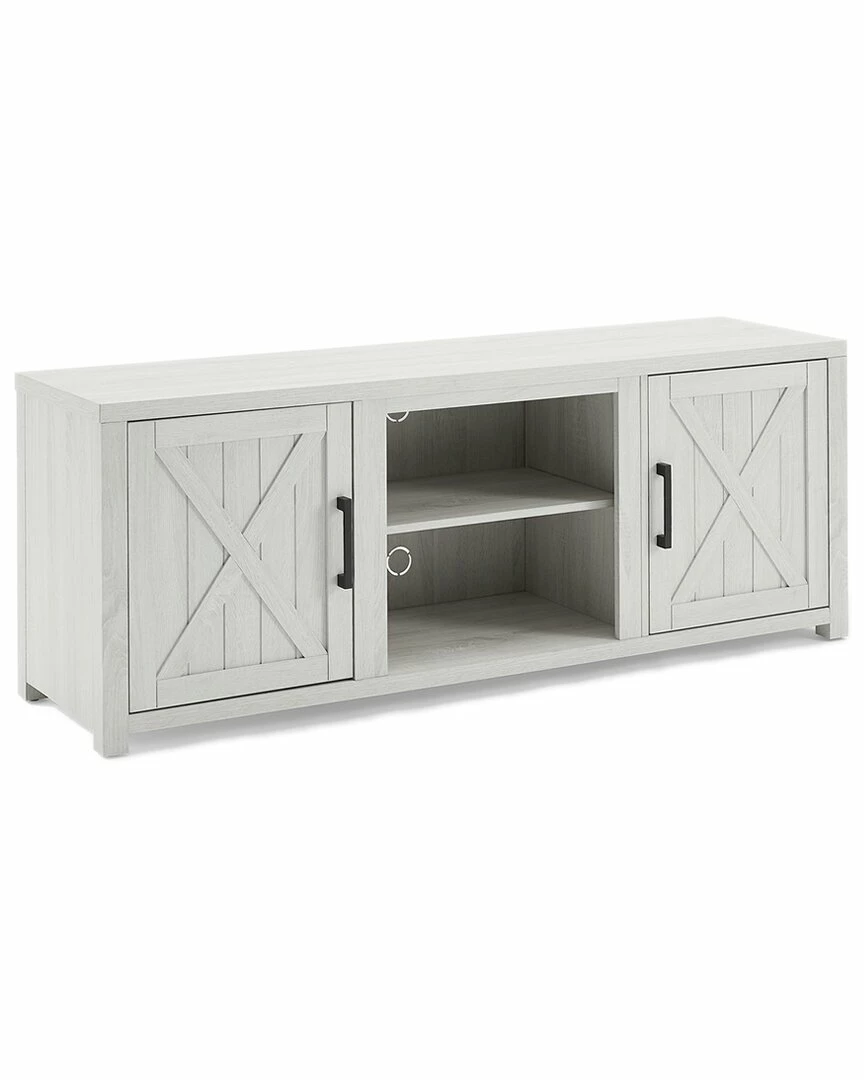 - Ever-trending modern farmhouse design meets functional home entertainment with the Gordon 58 Low-Profile TV Stand. Echoing the rustic charm of a classic barn door, the cabinet doors feature a slatted look with an x-motif. Adjustable shelving in the cabinets and center compartment offers flexible space for media components. Ideal for TVs up to 65, the Gordon TV Stand will make a beautiful focal point in any room.