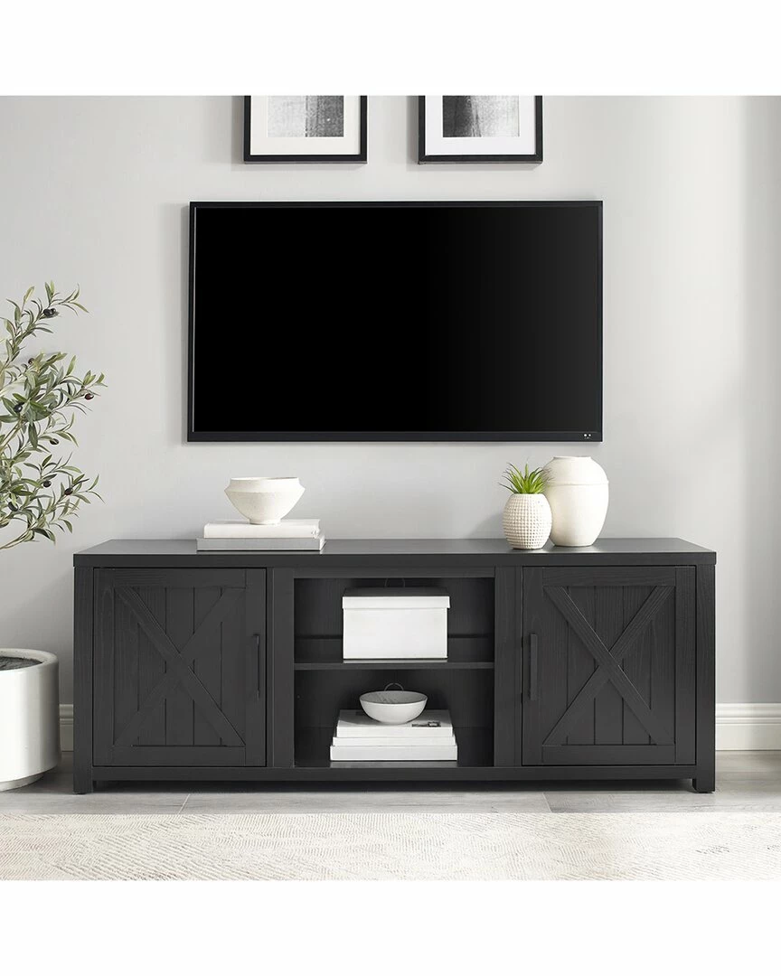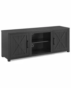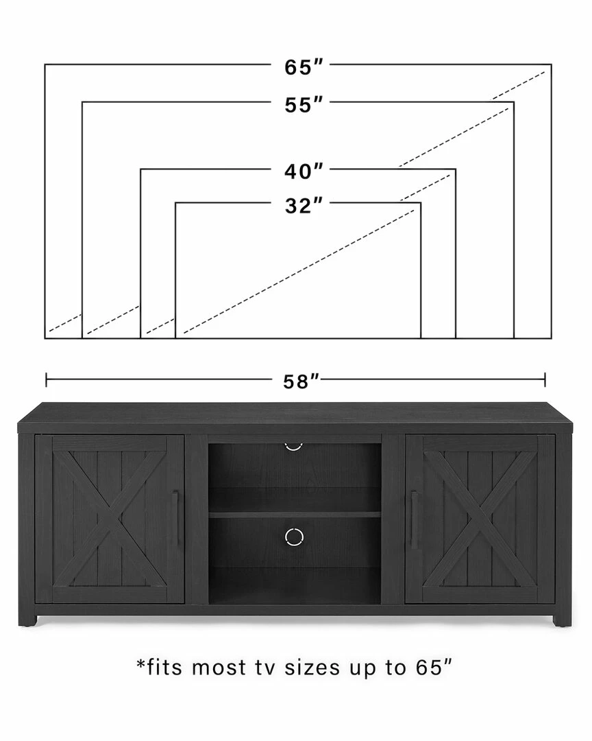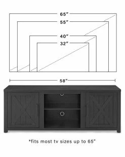 - Ever-trending modern farmhouse design meets functional home entertainment with the Gordon 58 Low-Profile TV Stand. Echoing the rustic charm of a classic barn door, the cabinet doors feature a slatted look with an x-motif. Adjustable shelving in the cabinets and center compartment offers flexible space for media components. Ideal for TVs up to 65, the Gordon TV Stand will make a beautiful focal point in any room.