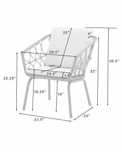 - Turn outdoor dining into a breezy bohemian affair with the Juniper 3pc Bistro Set. Crafted from rattan-style resin wicker, this set showcases delicate woven loops over steel frames. With lush, moisture-resistant cushions on the armchairs and a chic round table, the Juniper bistro set will be your favorite spot for a romantic meal al fresco. Bohemian design.Weather-resistant powder-coated steel frame.Handwoven rattan-style resin wicker in a natural finish.Creme cushion covers.High-performance solution-dyed polyester cushion covers resist mildew, sun fade, and abrasion.Moisture-resistant high grade cushion cores.Delicate loop design.Chairs have a classic barrel silhouette.Table weight limit is 100lbs.Chair Dimensions: 26.5″W x 23″D x 35.5″H/ 16.31lbs.Bistro Table Dimensions: 23.5″W x 23.5″D x 28″H / 9.92lbs………