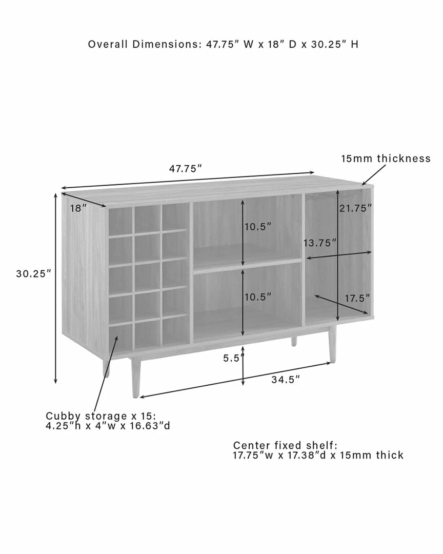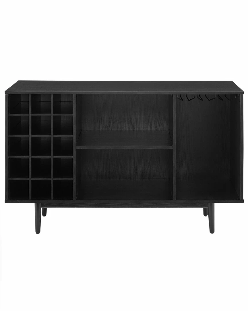 - Simple and stunning, the Liam Wine Storage Sideboard has a mid-century style perfect for the modern wine lover. Perched atop classic tapered legs, this sideboard features three open compartments that can accommodate dishes and decor, plus a 15-bottle wine rack and slots for wine glasses. Add the Liam Sideboard to your dining or family room for wine storage and display space. Mid-century modern design.Black finish.Tapered legs.Adjustable levelers on legs.Three open storage compartments each with a weight limit of 20lbs.15 compartment wine storage.Metal under-shelf stemware rack.Pairs well with industrial, rustic and modern decor.Sideboard top weight limit is 100lbs………..