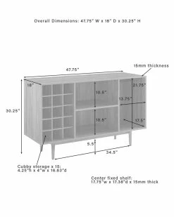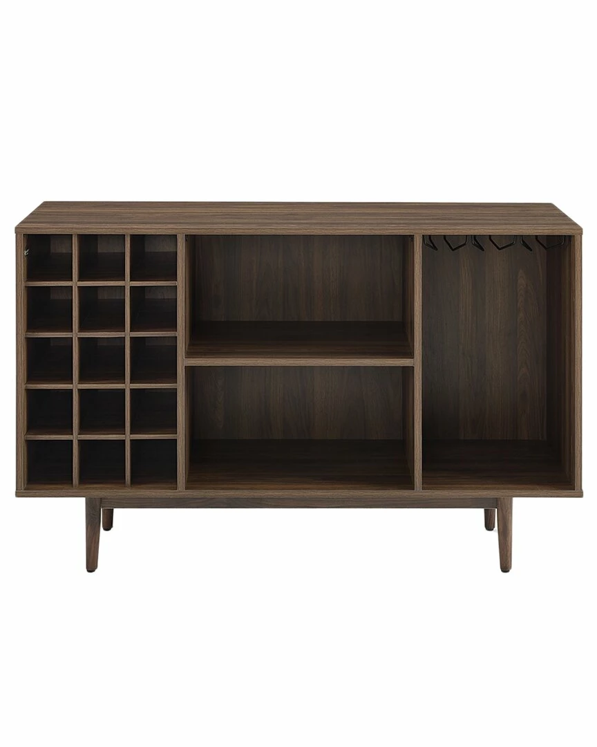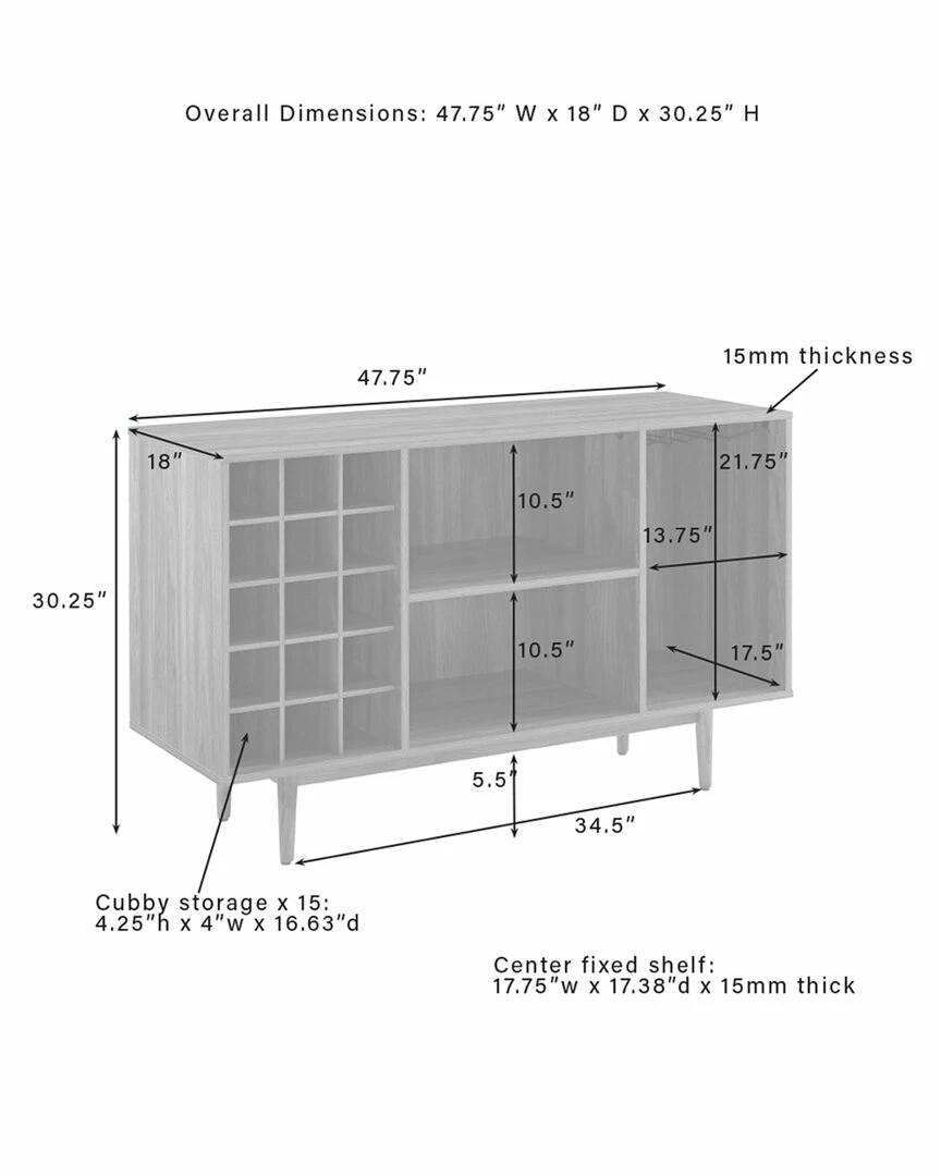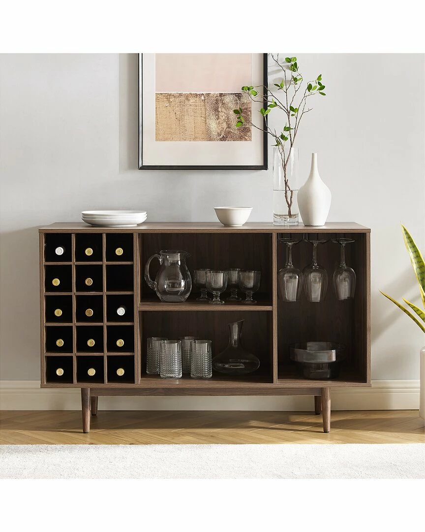 - Simple and stunning, the Liam Wine Storage Sideboard has a mid-century style perfect for the modern wine lover. Perched atop classic tapered legs, this sideboard features three open compartments that can accommodate dishes and decor, plus a 15-bottle wine rack and slots for wine glasses. Add the Liam Sideboard to your dining or family room for wine storage and display space. Mid-century modern design.Walnut finish.Tapered legs.Adjustable levelers on legs.Three open storage compartments each with a weight limit of 20lbs.15 compartment wine storage.Metal under-shelf stemware rack.Pairs well with industrial, rustic and modern decor.Sideboard top weight limit is 100lbs………..