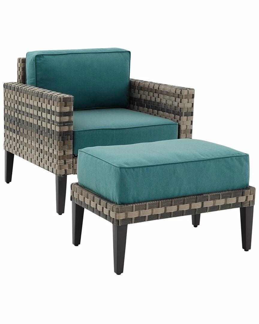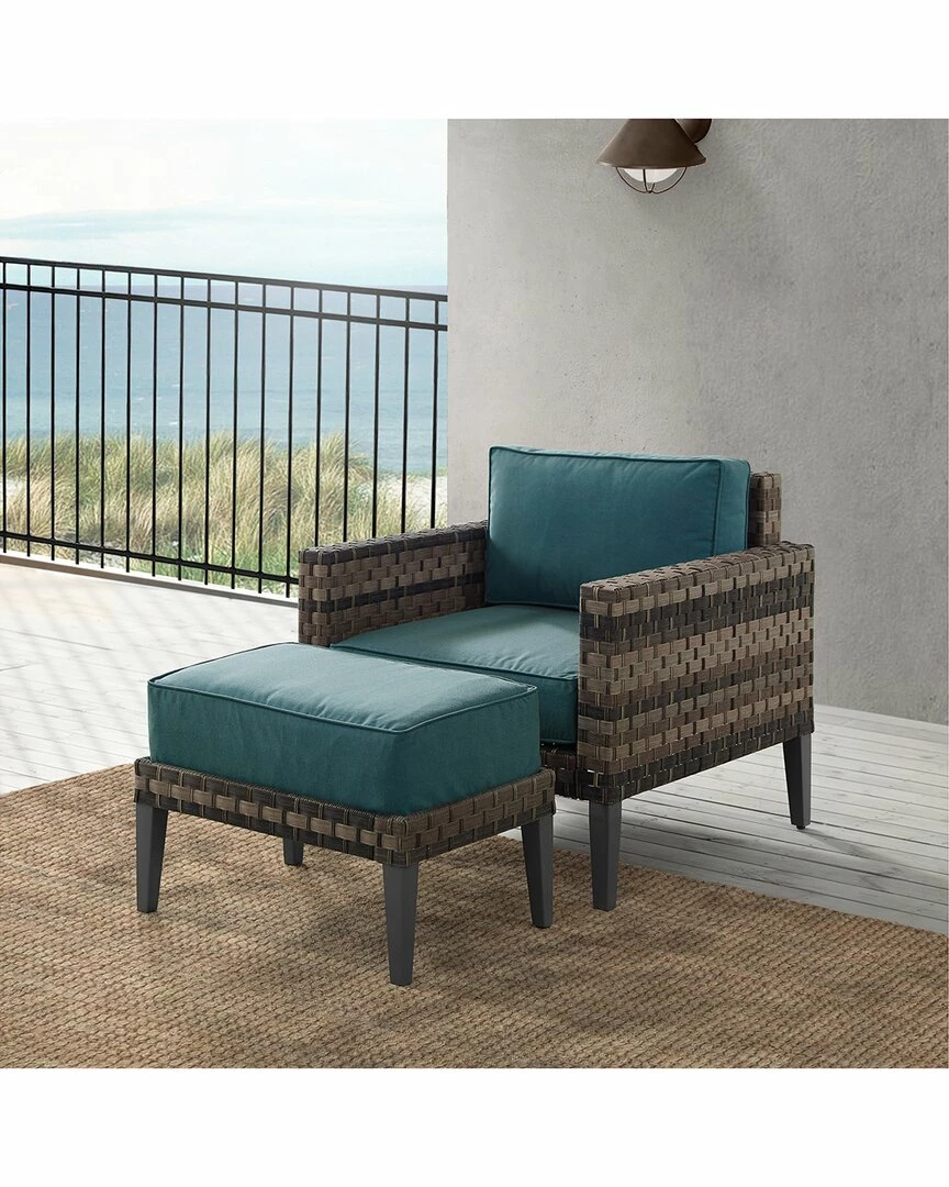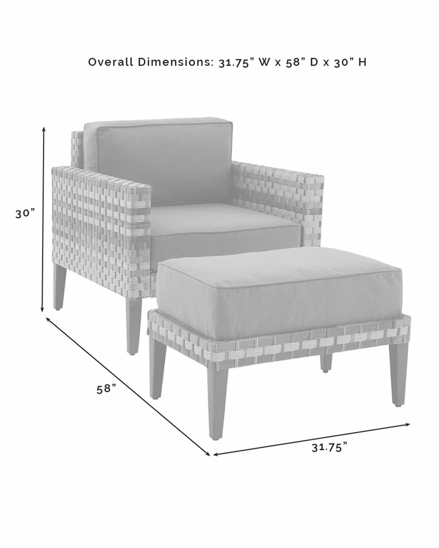 - Combining a modern silhouette and classic wicker, the Prescott 2pc Armchair Set is the luxurious seating you need for your outdoor retreat. Resistant to the whims of mother nature, the armchair and ottoman feature all-weather resin wicker handwoven over powder-coated steel frames. The wide wicker is beautifully weathered and has the textured feel of natural fiber. Topped with deep moisture-resistant cushions, the Prescott Armchair Set will be your favorite spot to relax in the sun. Modern design .UV resistant all-weather flat wide resin wicker.Weather-resistant powder-coated steel frame.Handwoven multi-tone brown resin wicker with a weathered natural texture.Due to the multi-tone wicker, color variation among pieces should be expected, and enhances the character of the product.Mineral blue cushion covers.Quick-drying olefin fabric cushion covers resist mildew and sun fade.Moisture-resistant high grade cushion cores.Removable cushion covers are machine washable.Steel tapered legs in a dark brown finish.Adjustable levelers on legs.Ottoman cushion sits in a recessed section of the ottoman to prevent slippage.Seating for up to two.Armchair Dimensions: 31.75″W x 32.5″D x 30″H / 32.56lbs.Ottoman Dimensions: 26.5″W x 18″D x 18″H / 14.08lbs…..