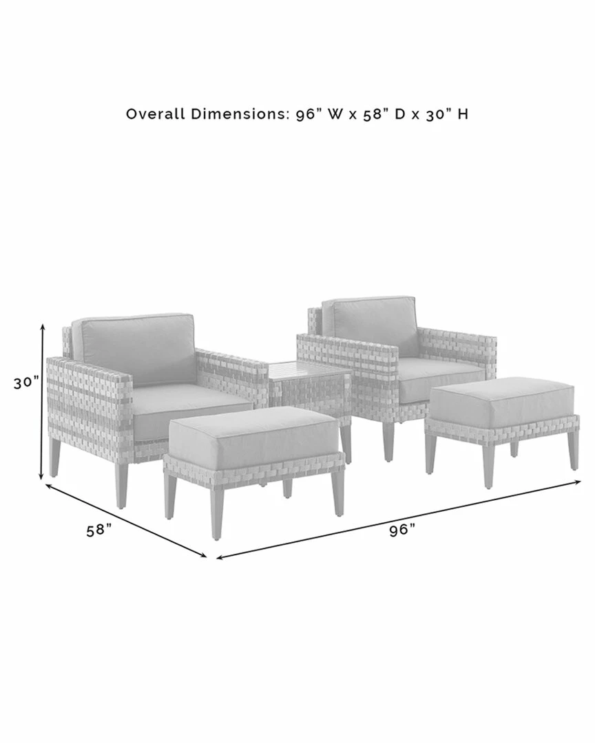 - Combining a modern silhouette and classic wicker, the Prescott 5pc Chair Set is the luxurious seating you need for your outdoor retreat. Resistant to the whims of mother nature, the armchairs, ottomans, and side table feature all-weather resin wicker handwoven over powder-coated steel frames. The wide wicker is beautifully weathered and has the textured feel of natural fiber. The side table’s slatted steel top offers durability and the perfect spot for resting a drink. Topped with deep moisture-resistant cushions, the Prescott Chair Set will be your favorite spot to spend time with a friend. Modern design .UV resistant all-weather flat wide resin wicker.Weather-resistant powder-coated steel frame.Handwoven multi-tone brown resin wicker with a weathered natural texture.Due to the multi-tone wicker, color variation among pieces should be expected, and enhances the character of the product.Taupe cushion covers.Quick-drying olefin fabric cushion covers resist mildew and sun fade.Moisture-resistant high grade cushion cores.Removable cushion covers are machine washable.Slatted steel tabletop in a dark brown finish.Steel tapered legs in a dark brown finish.Adjustable levelers on legs.Ottoman cushions sit in a recessed section of the ottoman to prevent slippage.Seating for up to four.Table weight limit is 100lbs.Armchair Dimensions: 31.75″W x 32.5″D x 30″H / 32.56lbs.Ottoman Dimensions: 26.5″W x 18″D x 18″H / 14.08lbs.Side Table Dimensions: 20″W x 20″D x 20.25″H / 23.1lbs..