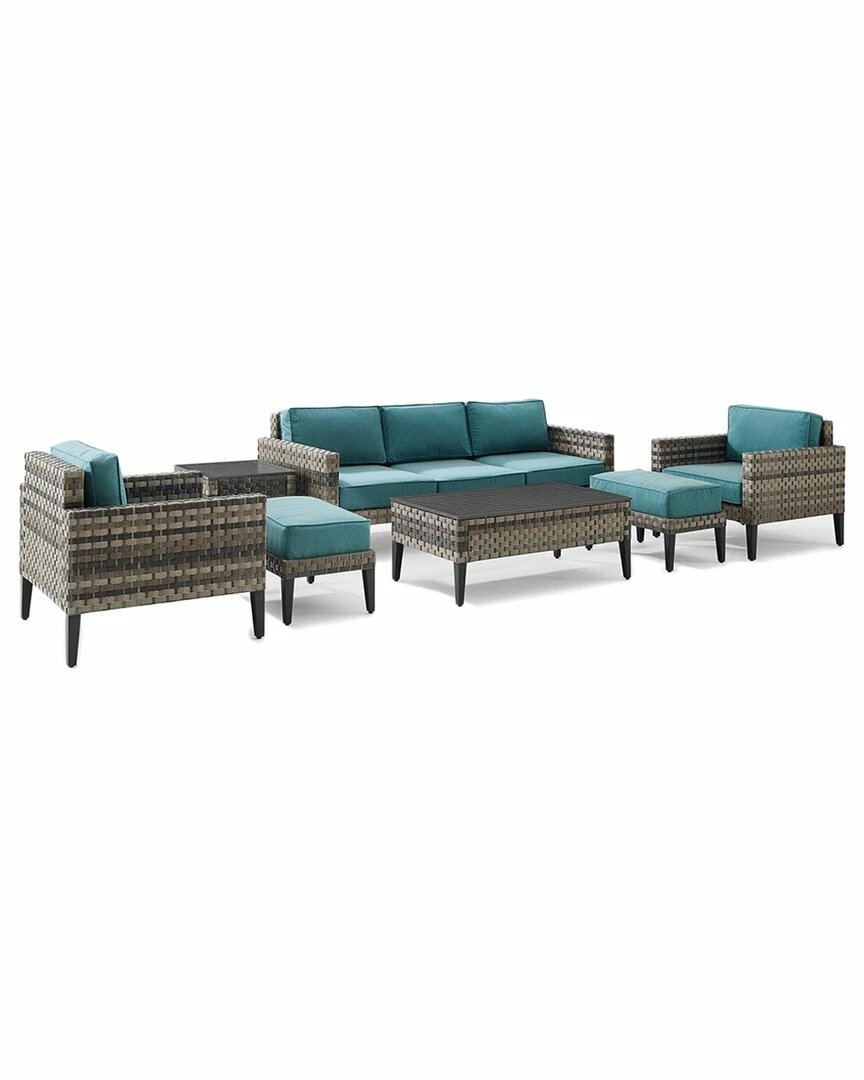 - Craft your outdoor oasis with the Prescott 7pc Sofa Sets combination of classic wicker and a modern silhouette. Resistant to the whims of mother nature, this set features all-weather resin wicker woven over powder-coated steel frames. Beautifully weathered, the wide wicker has the textured feel of natural fiber. The sofa, armchairs, and ottomans offer deep moisture-resistant cushions, while the tables feature slatted steel tops. Each piece of the Prescott Sofa Set brings comfort and convenience to entertaining outside. Modern design .UV resistant all-weather flat wide resin wicker.Weather-resistant powder-coated steel frame.Handwoven multi-tone brown resin wicker with a weathered natural texture.Due to the multi-tone wicker, color variation among pieces should be expected, and enhances the character of the product.Mineral blue cushion covers.Quick-drying olefin fabric cushion covers resist mildew and sun fade.Moisture-resistant high grade cushion cores.Removable cushion covers are machine washable.Slatted steel tabletops in a dark brown finish.Steel tapered legs in a dark brown finish.Adjustable levelers on legs.Ottoman cushions sit in a recessed section of the ottoman to prevent slippage.Seating for up to seven.Table weight limit is 100lbs.Sofa Dimensions: 81.5″W x 32.5″D x 30″H / 69.3lbs.Armchair Dimensions: 31.75″W x 32.5″D x 30″H / 32.56lbs.Ottoman Dimensions: 26.5″W x 18″D x 18″H / 14.08lbs.Coffee Table Dimensions: 43.25″W x 24″D x 17.13″H / 34.1lbs.Side Table Dimensions: 20″W x 20″D x 20.25″H / 23.1lbs