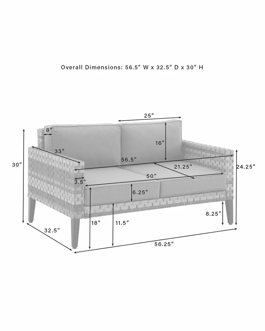 - Offering a modern take on classic wicker, the Prescott Loveseat is a great addition to your at-home retreat. Resistant to the whims of mother nature, this loveseat features all-weather resin wicker woven over a powder-coated steel frame. The wide wicker is beautifully weathered and has the textured feel of natural fiber. Topped with deep, moisture-resistant cushions, the Prescott Loveseat will be your favorite place to relax in the sun. Modern design .UV resistant all-weather flat wide resin wicker.Weather-resistant powder-coated steel frame.Handwoven multi-tone brown resin wicker with a weathered natural texture.Due to the multi-tone wicker, color variation among pieces should be expected, and enhances the character of the product.Mineral blue cushion covers.Quick-drying olefin fabric cushion covers resist mildew and sun fade.Moisture-resistant high grade cushion cores.Removable cushion covers are machine washable.Steel tapered legs in a dark brown finish.Adjustable levelers on legs.Seating for up to two……..