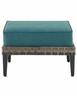 - Kick up your feet and catch some sun with the Prescott Ottoman. Wrapped in all-weather wicker, this ottoman is resistant to the whims of mother nature. The wide wicker is beautifully weathered and has the textured feel of natural fiber. With its thick, moisture-resistant cushion, the Prescott Ottoman can double as extra seating for your outdoor retreat. Modern design .UV resistant all-weather flat wide resin wicker.Weather-resistant powder-coated steel frame.Handwoven multi-tone brown resin wicker with a weathered natural texture.Due to the multi-tone wicker, color variation among pieces should be expected, and enhances the character of the product.Mineral blue cushion covers.Quick-drying olefin fabric cushion covers resist mildew and sun fade.Moisture-resistant high grade cushion cores.Removable cushion covers are machine washable.Cushion sits in a recessed section of the ottoman to prevent slippage.Steel tapered legs in a dark brown finish.Adjustable levelers on legs……..