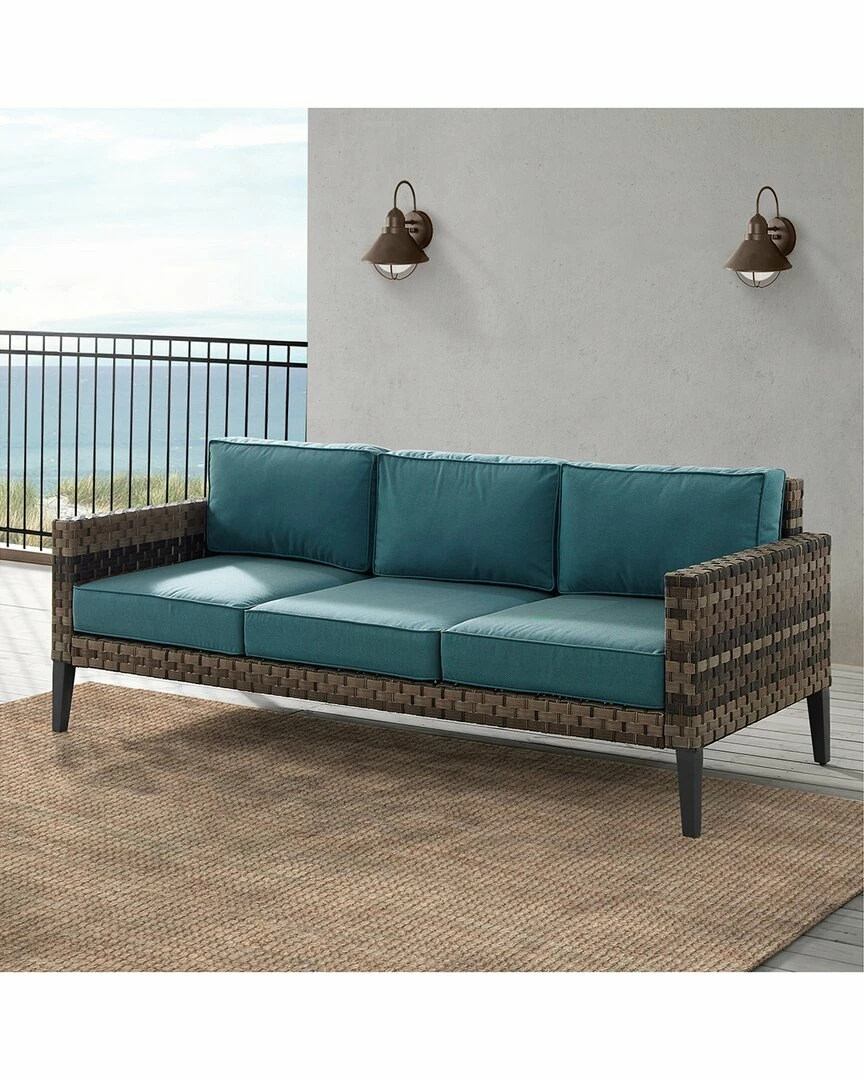 - Combining a modern silhouette and classic wicker, the Prescott Sofa is the luxurious seating you need for your outdoor retreat. Covered in rich, all-weather resin wicker, this sofa is resistant to the whims of mother nature. The wide wicker is beautifully weathered and has the textured feel of natural fiber. Topped with deep moisture-resistant cushions, the Prescott Sofa will be your favorite spot to relax in the sun or gather with friends. Modern design .UV resistant all-weather flat wide resin wicker.Weather-resistant powder-coated steel frame.Handwoven multi-tone brown resin wicker with a weathered natural texture.Due to the multi-tone wicker, color variation among pieces should be expected, and enhances the character of the product.Mineral blue cushion covers.Quick-drying olefin fabric cushion covers resist mildew and sun fade.Moisture-resistant high grade cushion cores.Removable cushion covers are machine washable.Steel tapered legs in a dark brown finish.Adjustable levelers on legs.Seating for up to three……..