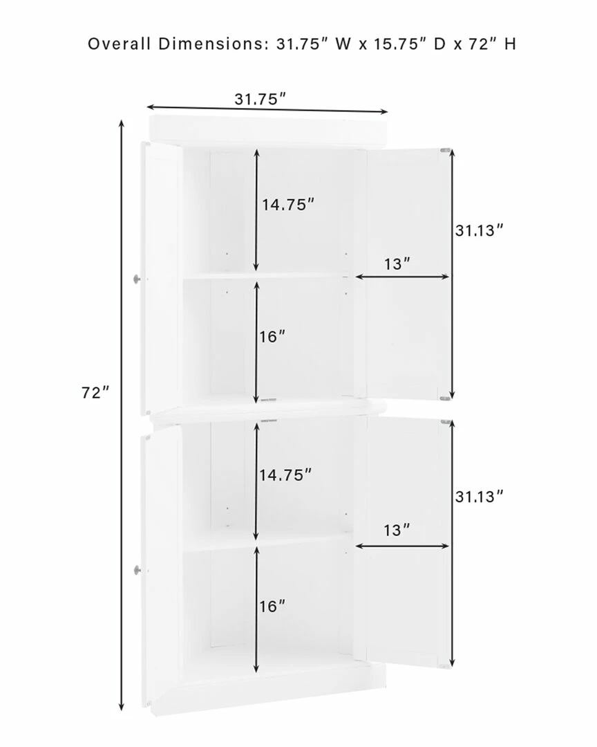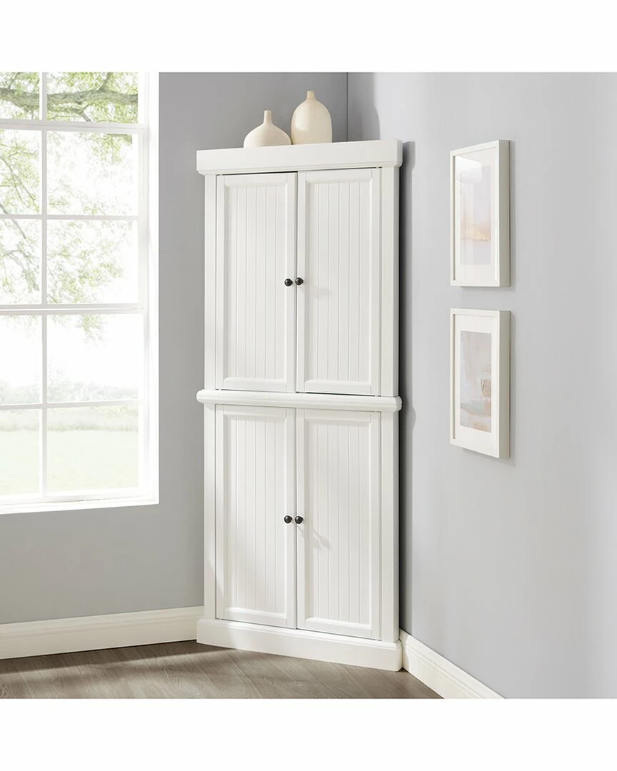 - With charming beadboard details, the Shoreline Pantry provides a dash of coastal flair to home organization. Comprised of two identical stackable pantries, this set is connected with a sturdy metal plate, offering ample storage without taking up valuable floor space. Ideal for smaller rooms, the Shoreline Tall Corner Pantry offers adjustable shelving and is designed to tuck neatly into any corner of the home. Coastal design.White finish.Genuine metal hardware with a bronze finish.Beadboard paneling on doors.Cabinet doors have magnetic closures.Each cabinet has an adjustable and removable shelf with a 15lb weight limit per shelf.Includes metal plate for stacking two units together.Can be used in a bathroom, home office, or kitchen.Pairs well with traditional and farmhouse decor………..