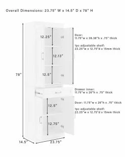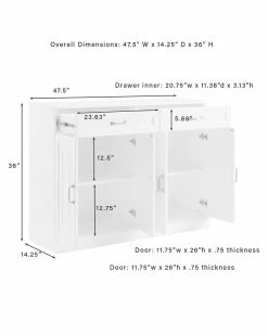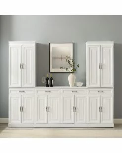 - Amazingly versatile with storage galore! The Stanton 3pc Sideboard and Pantry Set has the look of classic built-in cabinetry with a flexible modular design. Featuring a total of six large cabinets with adjustable shelves and panel doors, this home organization set stows a variety of everyday items. Perfect for a dining room or home office, the four full-extension drawers are ideal for storing flatware or office supplies. The Stanton 3pc Sideboard and Pantry Set is ready to create a custom look in any room of your home. Traditional design.White finish.Genuine metal hardware in a brushed nickel finish.All cabinets have double doors, magnetic closures, and concealed hinges.Both upper pantry cabinets have two adjustable and removable shelves each with a 15lb weight limit.The sideboard and lower pantry cabinets each have an adjustable and removable shelf with a 15lb weight limit.Four full-extension storage drawers on ball-bearing glides, each with a 15lb weight limit.Recessed paneling on cabinet doors and drawer fronts.All pieces are modular to maximize space and flexibility.Pairs well with modern farmhouse decor.Pantry Dimensions: 23.75″W x 14.5″D x 78 / 110.88.Sideboard Dimensions: 47.5″W x 14.25″D x 36″H / 100.32……..