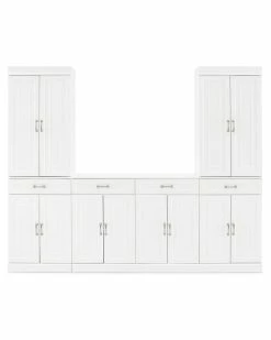 - Amazingly versatile with storage galore! The Stanton 3pc Sideboard and Pantry Set has the look of classic built-in cabinetry with a flexible modular design. Featuring a total of six large cabinets with adjustable shelves and panel doors, this home organization set stows a variety of everyday items. Perfect for a dining room or home office, the four full-extension drawers are ideal for storing flatware or office supplies. The Stanton 3pc Sideboard and Pantry Set is ready to create a custom look in any room of your home. Traditional design.White finish.Genuine metal hardware in a brushed nickel finish.All cabinets have double doors, magnetic closures, and concealed hinges.Both upper pantry cabinets have two adjustable and removable shelves each with a 15lb weight limit.The sideboard and lower pantry cabinets each have an adjustable and removable shelf with a 15lb weight limit.Four full-extension storage drawers on ball-bearing glides, each with a 15lb weight limit.Recessed paneling on cabinet doors and drawer fronts.All pieces are modular to maximize space and flexibility.Pairs well with modern farmhouse decor.Pantry Dimensions: 23.75″W x 14.5″D x 78 / 110.88.Sideboard Dimensions: 47.5″W x 14.25″D x 36″H / 100.32……..