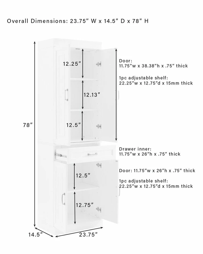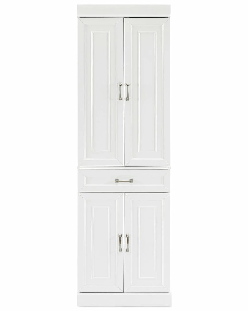 - The Stanton Pantry combines classic styling with the versatility of modular design. Featuring adjustable shelves in the lower and upper cabinets plus a full-extension drawer, this pantry is great for home organization. Panel doors on the cabinets keep everyday items out of sight, while the modularity of the Stanton pantry allows it to mix with other items in the collection for customizable storage. Traditional design.White finish.Genuine metal hardware in a brushed nickel finish.Two large cabinets with double doors, magnetic closures, and concealed hinges.Two adjustable and removable shelves in upper cabinet with a 15lb weight limit.Adjustable shelf in lower cabinet with a 15lb weight limit.Full-extension storage drawer on ball-bearing glides with a 15lb weight limit.Recessed paneling on cabinet doors and drawer front.Modular design allows multiple units to be paired together or with other items in the collection.Pairs well with modern farmhouse decor……….