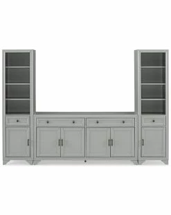 - Whether you love a traditional look or a modern farmhouse vibe, the Tara 3pc Entertainment Set is a stylish take on a classic entertainment center. The sideboard features two wide full-extension drawers and two large cabinets with adjustable shelves. Each bookcase has a full-extension drawer and three open adjustable shelves. The Tara 3pc Entertainment Set is a great storage option for framing large TVs up to 65″. Modern farmhouse design.Distressed gray finish.Genuine metal hardware in a distressed brass finish.The sideboard has two large cabinets with double doors and magnetic closures.The sideboard has two full-extension drawers on ball-bearing glides, each with a 15lb weight limit.Each bookcase features a full-extension storage drawer on ball-bearing glides with a weight limit of 15lbs.Each bookcase has three adjustable/removable shelves, each with a 15lb weight limit.Each bookcase has a cabinet door with magnetic closures which can be installed on the left or right of the bookcase.Each cabinet has an adjustable and removable shelf with a 15lb weight limit per shelf.Fits most TV’s up to 65″.All pieces are modular to maximize space and flexibility.Pairs well with traditional decor.Sideboard top weight limit is 100lbs.Bookcase Dimensions: 18″W x 15″D x 67.63″H / 72.6lbs.Sideboard Dimensions: 61″W x 15″D x 29.63″H / 97.9lbs…..