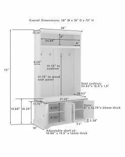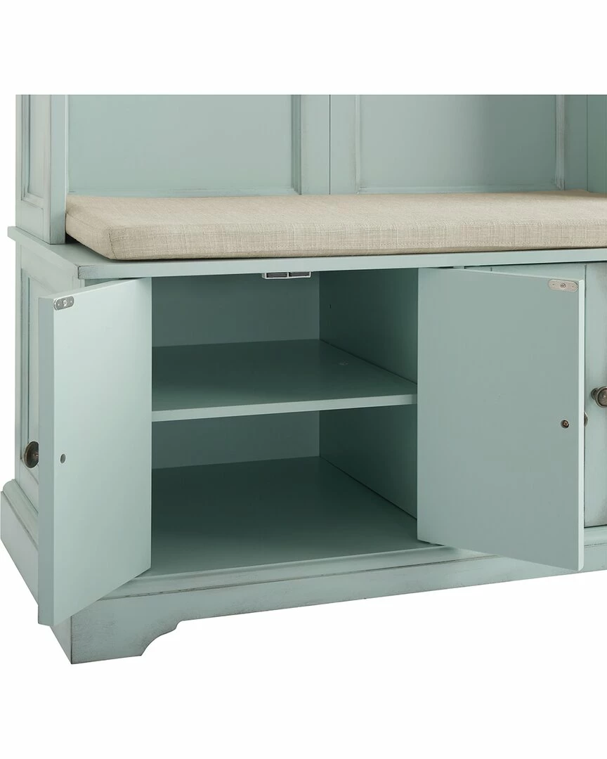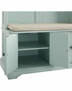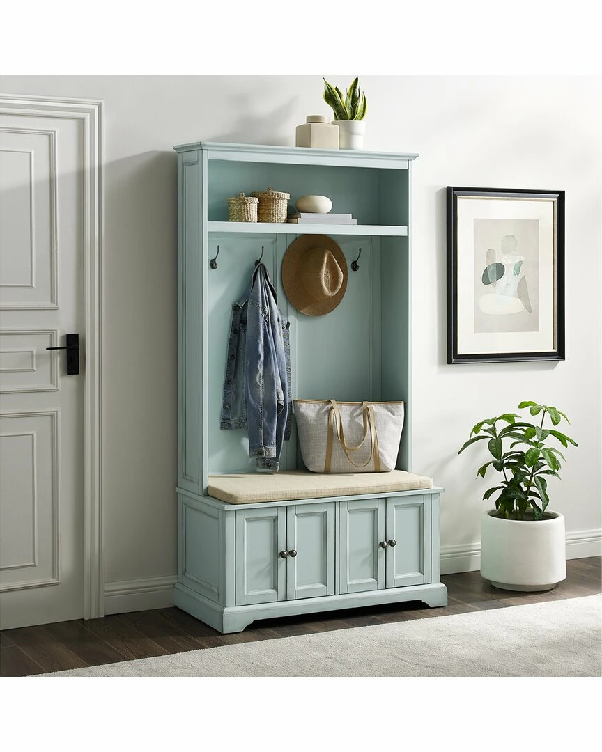 - The Holbrook Hall Tree brings vintage charm to any entryway. Featuring a sizable bench and two storage cabinets with adjustable shelves, you can easily sit down and tuck away your shoes at the end of the day. The open stationary shelf corrals smaller items while the four double prong hooks keep coats and hats accessible. Whether you are coming or going, the Holbrook Hall Tree keeps all your everyday items close at hand.