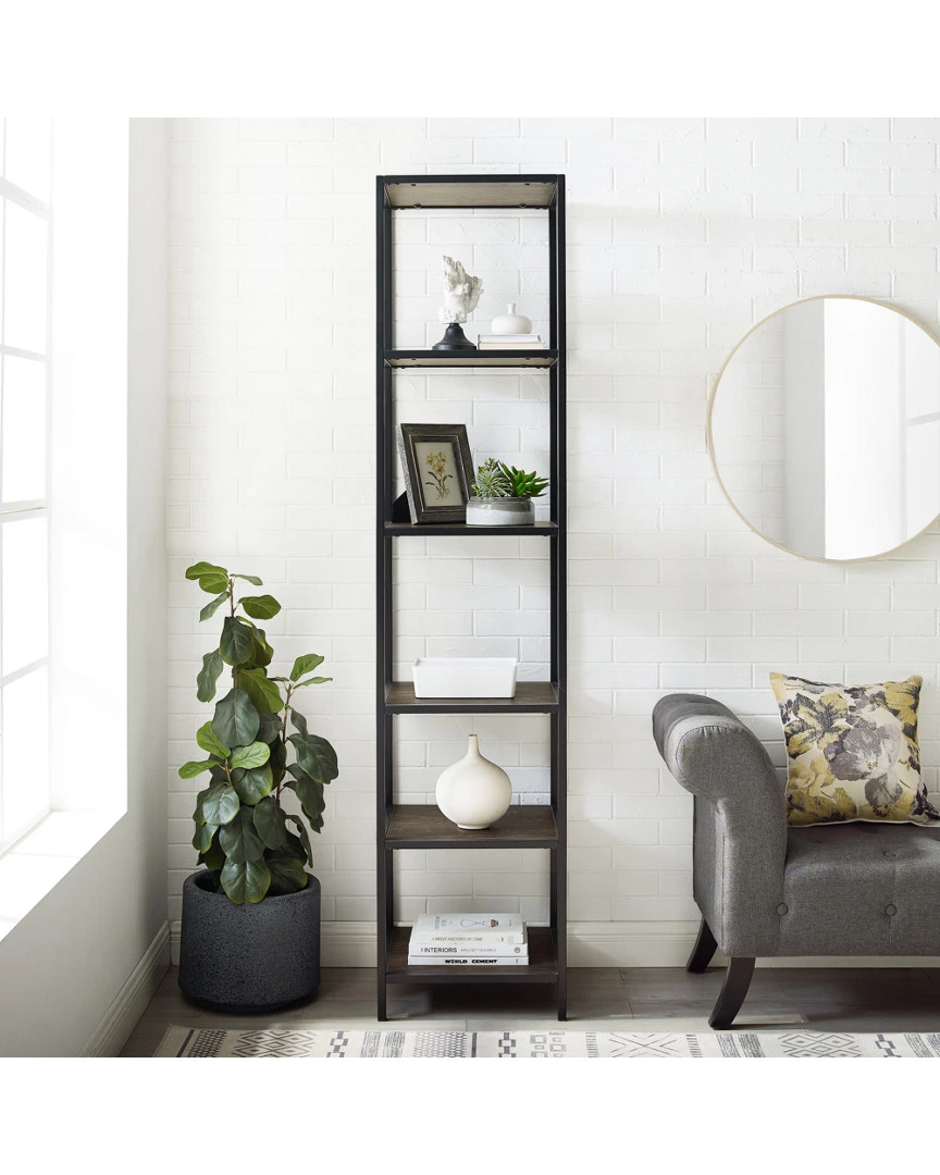 - Whether displaying treasured keepsakes or storing everyday items, the industrial edge of the Jacobsen Narrow Etagere fits the bill. With stunning simplicity, the etagere features a combination of steel and the look of rustic wood. The five stationary shelves offer sturdy storage space, yet maintain a sleek and streamlined silhouette.