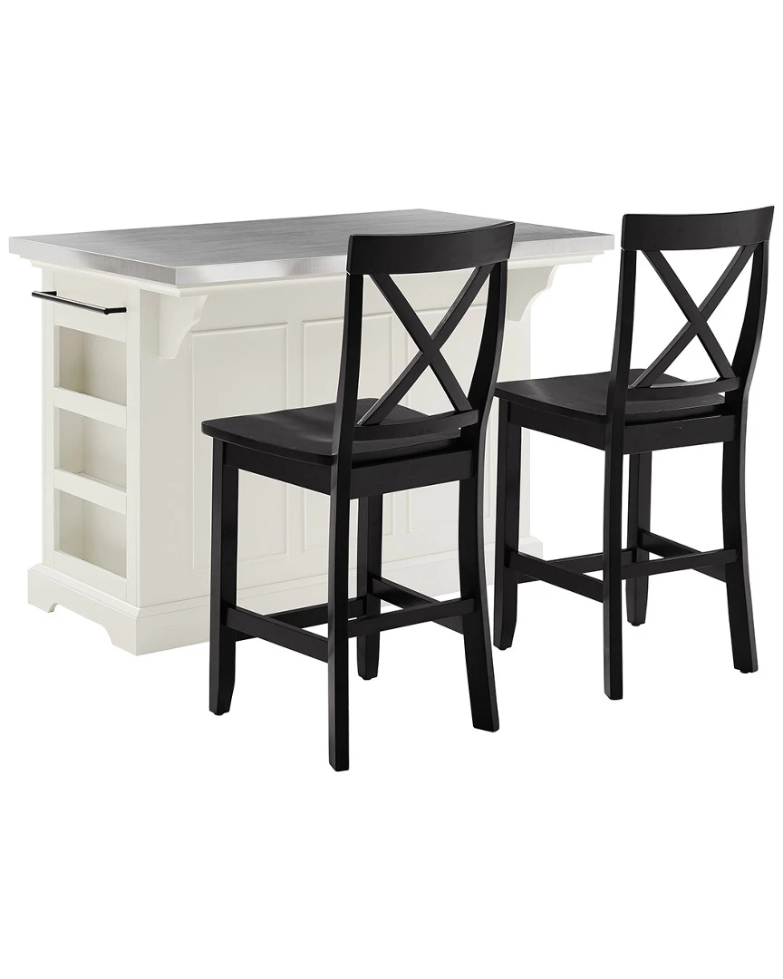 - Design details: The Julia 3pc Kitchen Island Set offers space for food prep, entertaining, and casual dining all in one stylish package. The spacious counter top extends past the island base to accommodate two X-Back Counter Height Bar Stools. With a traditional x-back design, the bar stools add a unique flair to the set. The kitchen island features five storage drawers and two spacious cabinets, making kitchen organization a breeze. Additional details like a built-in spice rack and towel bar are icing on the cake for this classic multi-functional design.