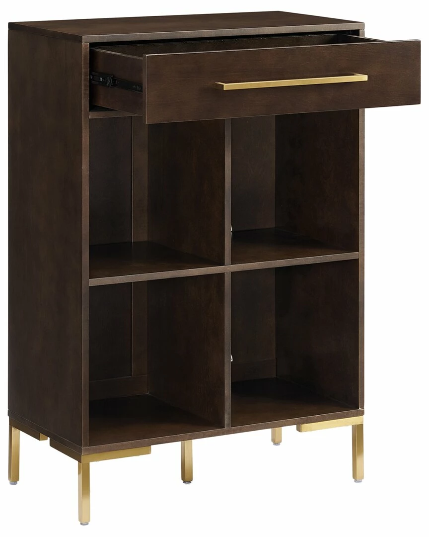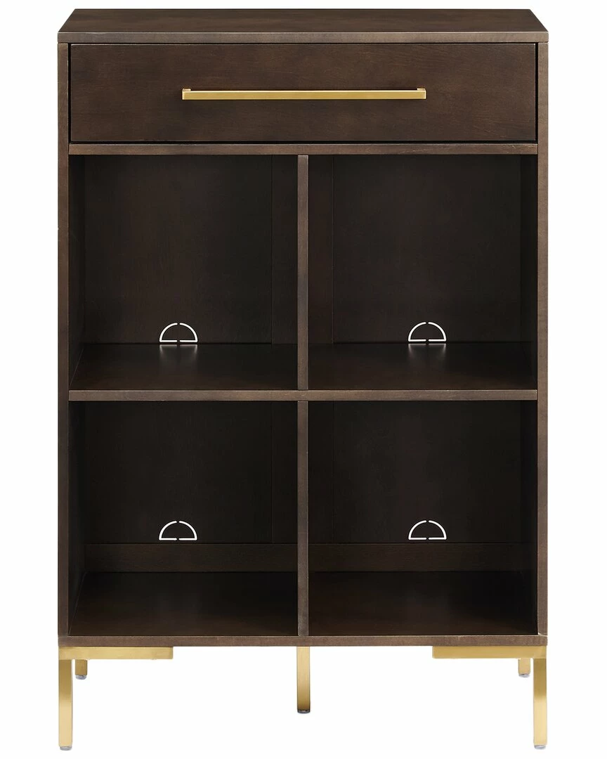 - Color/finish: dark brown finish on bookcase with steel legs in a brushed brass finish