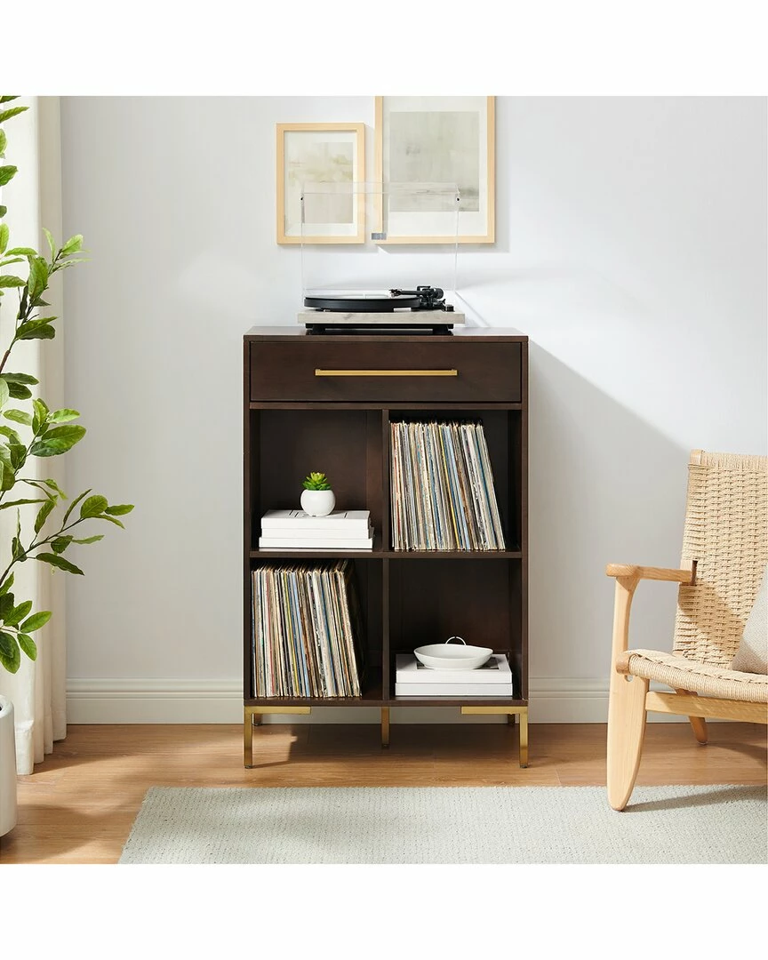 - Incorporate streamlined modern storage into your home with the Juno Record Storage Cube Bookcase. Featuring a sleek silhouette and stylish hardware, this bookcase has four cube shelves sized perfectly for standard records as well as books or decor. The drawer offers storage for electronic accessories and cleaning supplies, while the top of the bookcase accommodates a variety of standard record players. Create a dedicated listening room anywhere in your home with the Juno Record Storage Cube Bookcase.