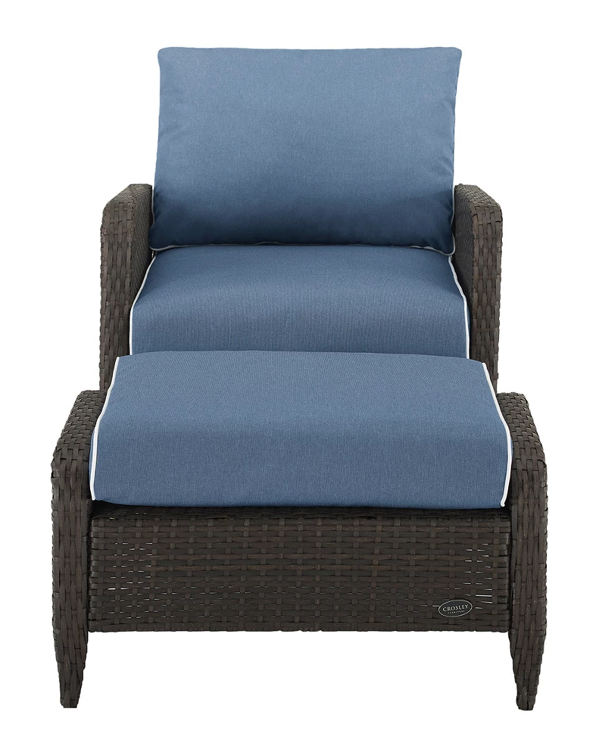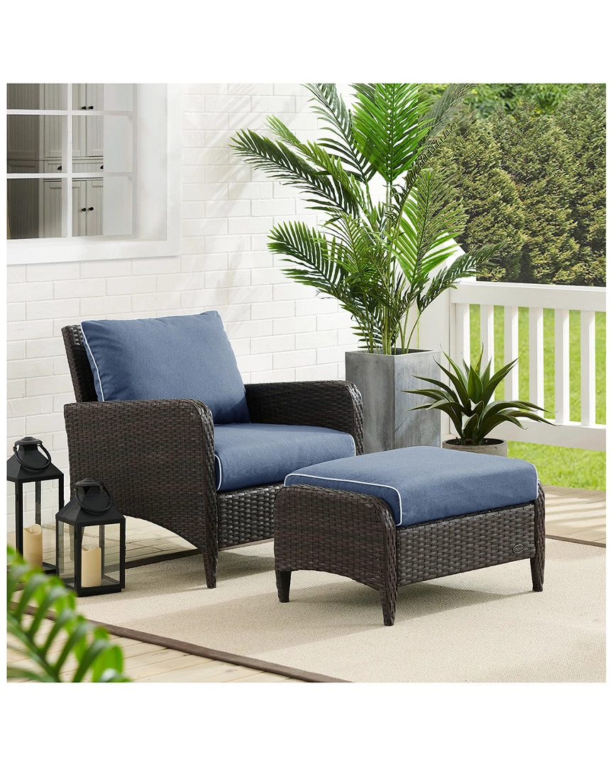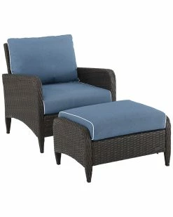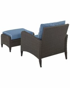 - Design details: Relax and unwind with the Kiawah 2pc Chair Set. Enjoy the deep seating and plush piped cushions of the chair, as well as, the equally lush cushioned ottoman. Featuring durable powder-coated steel frames covered in beautiful all-weather wicker, this chair and ottoman are built for style and durability. So prop up your feet and soak up some sun with the Kiawah 2pc Chair Set; Transitional design ; Brown reed-style flat wicker; UV resistant outdoor resin wicker; Durable powder-coated steel frame; Cool blue colored cushion covers with white piping; Moisture-resistant high grade cushion cores; Weather-resistant solution dyed polyester cushion covers