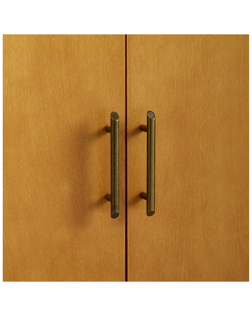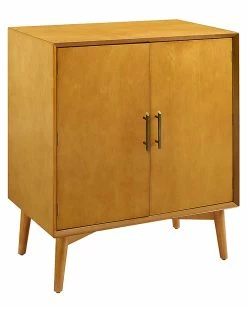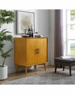 - Design details: Make the Landon bar cabinet your signature mid-century piece. With short tapered legs and a square shape, this bar cabinet has a sleek design that lends itself to being an easy addition to most rooms of your home. The warm acorn finish is highlighted by the antique brass handles on the doors. Open these doors to reveal plenty of storage space for wine and cocktail glasses. There are also designated spaces for bottles within the cabinet, as well as, on the inside of the doors. Use the ample counter space as a mixing station, or a place to display nick knacks. The Landon bar cabinet is versatile and ready to party; Mid Century Modern Design; Tapered Legs; Constructed of Solid Poplar and Manufactured Wood; Two Large Cabinets with Adjustable Shelves; Three Large Drawers; Full Extension Glides; Convenient Storage for Barware & Spirits; Genuine Metal Hardware; Light Assembly Required