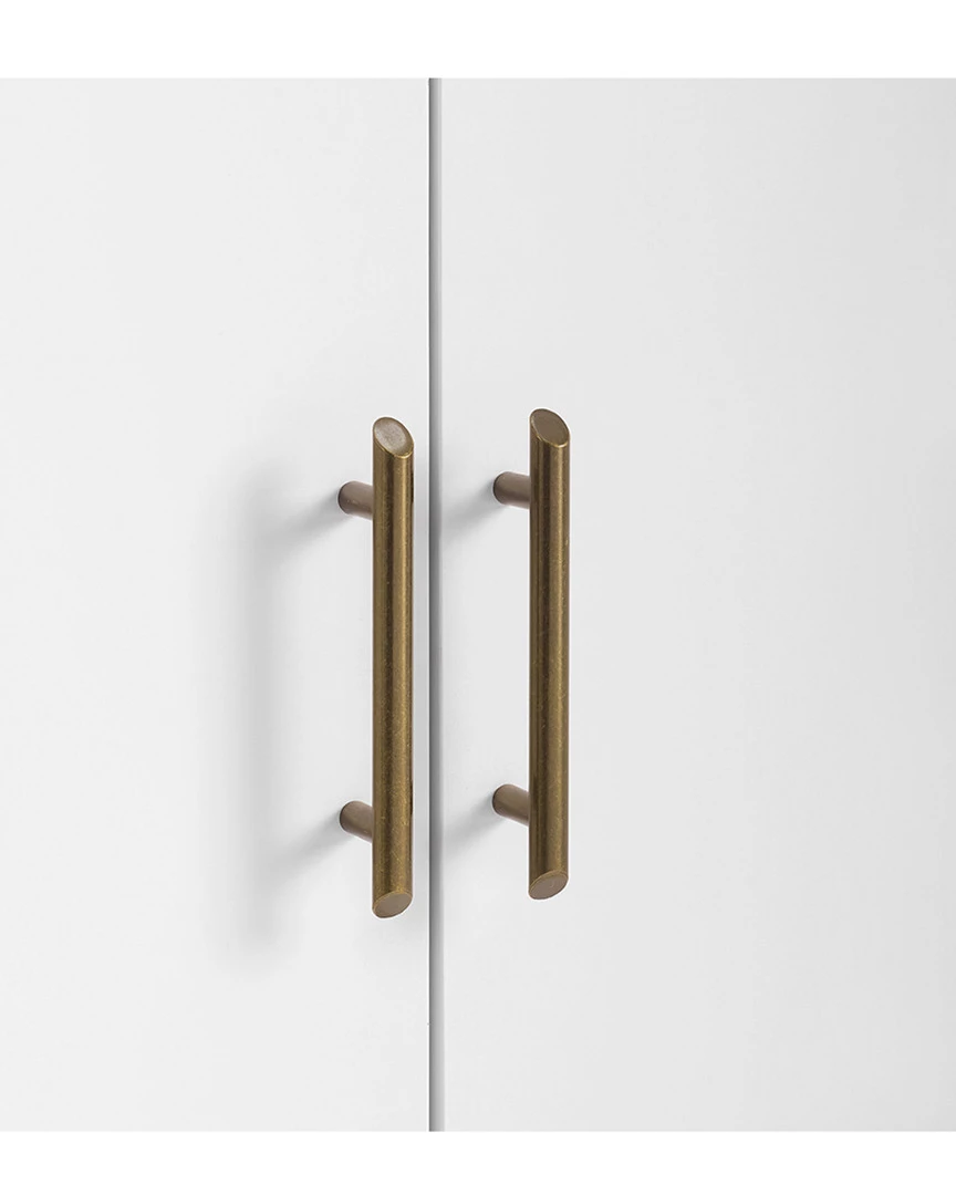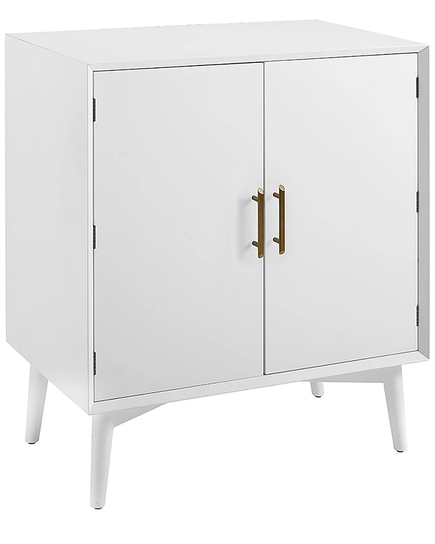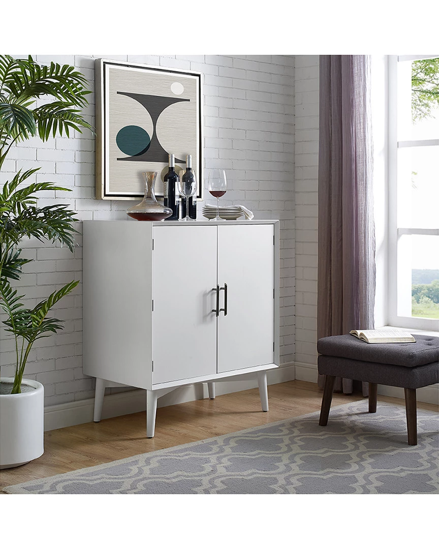 - Design details: Make the Landon bar cabinet your signature mid-century piece. With short tapered legs and a square shape, this bar cabinet has a sleek design that lends itself to being an easy addition to most rooms of your home. The warm acorn finish is highlighted by the antique brass handles on the doors. Open these doors to reveal plenty of storage space for wine and cocktail glasses. There are also designated spaces for bottles within the cabinet, as well as, on the inside of the doors. Use the ample counter space as a mixing station, or a place to display nick knacks. The Landon bar cabinet is versatile and ready to party; Mid Century Modern Design; Tapered Legs; Constructed of Solid Poplar and Manufactured Wood; Two Large Cabinets with Adjustable Shelves; Three Large Drawers; Full Extension Glides; Convenient Storage for Barware & Spirits; Genuine Metal Hardware; Light Assembly Required