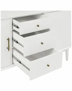 - Design details: Mid-Century Modern style returns with Crosley’s Landon collection. The versatile Landon Buffet can serve as an innovative media cabinet or as a sleek side buffet. Along with the two spacious cabinets, the three center drawers roll out on full extension glides, giving easy access to every corner. The slender, round tapered legs and modern lines are echoed in the genuine metal drawer pulls and cabinet handles. With a beautiful smooth finish, the Landon collection is perfect for bringing elegant simplicity into any home; Mid Century Modern Design; Constructed of Solid Poplar and Manufactured Wood; Tapered Legs; Ideal for Use as a Buffet or Media Cabinet; Two Large Cabinets with Adjustable Shelves; Three Large Drawers; Full Extension Glides; Genuine Metal Hardware; Light Assembly Required
